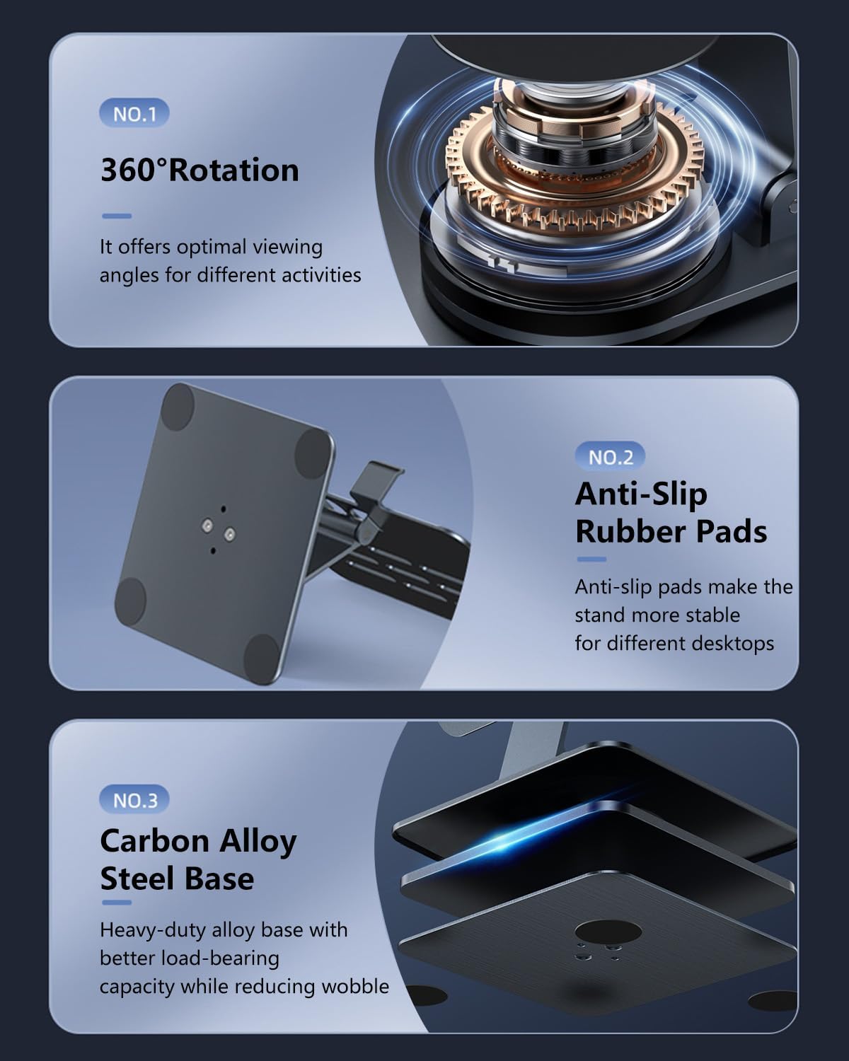 - Perfect Viewing Angle: This tablet stand features an innovative locking mechanism that allows you to adjust the height and angle. Whether you need a low profile for typing or a higher position for video conferencing, this stand holds its position securely, providing a custom viewing experience for your needs