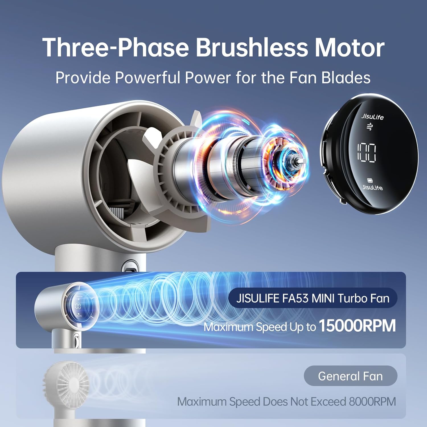 - Brushless Motor - Super Power: The combination of a three-phase brushless motor and a 5000mAh battery significantly improves the wind speed, power, and endurance. The maximum wind speed can reach 9m/s. The highest rotation speed of the handheld fan is three times that of a regular personal fan, reaching up to 15000 RPM. It can cool for 3-15 hours on a single charge