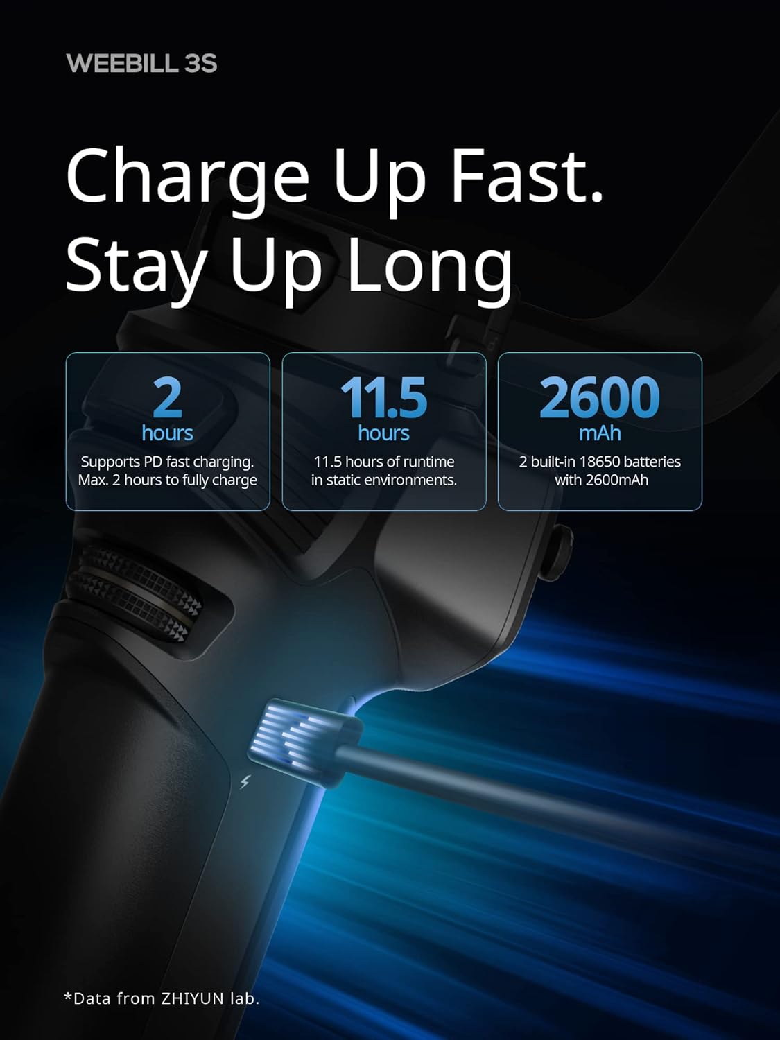 - [PD Fast Charging, Ultra-Long Battery Life] Weebill 3S camera gimbal stabilizer supports PD fast charging for 2 hours, built-in 2*2600mAh batteries, ultra-long battery life of 11.5 hours. Wide range of camera mounting, suitable for most of the DSLR/Micro SLR cameras on the market from Nikon, Panasonic, Canon, and Sony, meets the mainstream DSLR/Micro SLR+24-70 F2.8 lens mounting leveling of each brand.