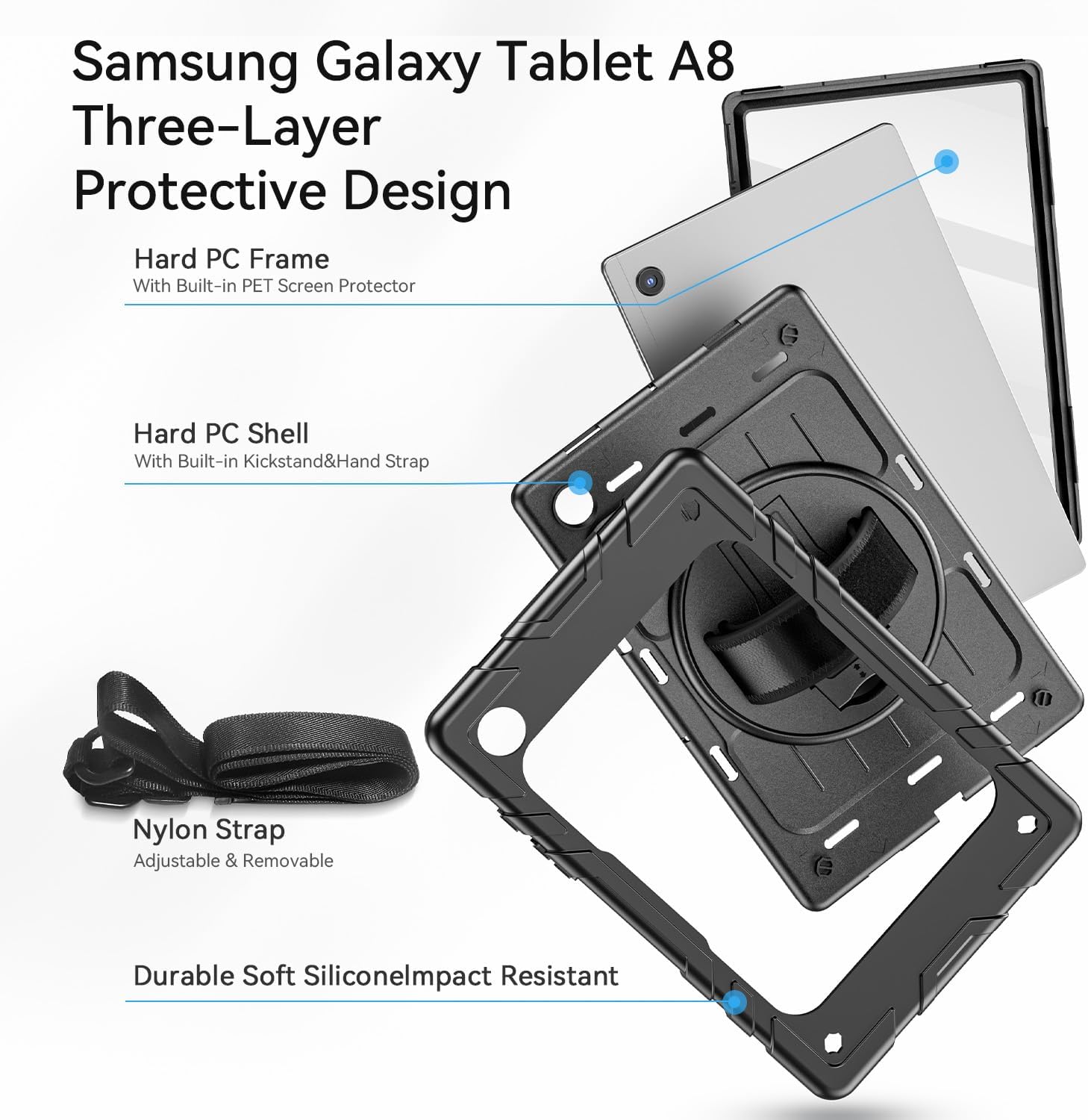 - Full-body Protection with PET Screen Protector: 3-layer total front-and-back protection case for Samsung Galaxy Tab A8 10.5'' 2022, combined with 1-layer soft silicone and 2-layer hard polycarbonate front frame and back cover, providing protection for your tablet against accidental drops, scratches, and shocks.