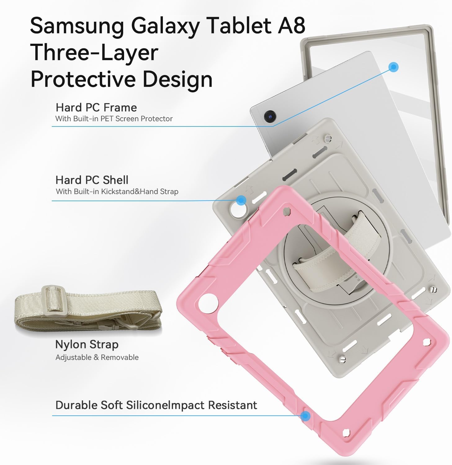 for Samsung Galaxy Tablet A8 Case 10.5 inch 2022 SM-X200/X205/X207 with Screen Protector [360 Rotating Stand] &Hand Shoulder Strap Shockproof Rugged Protective Cover|Pink&Beige