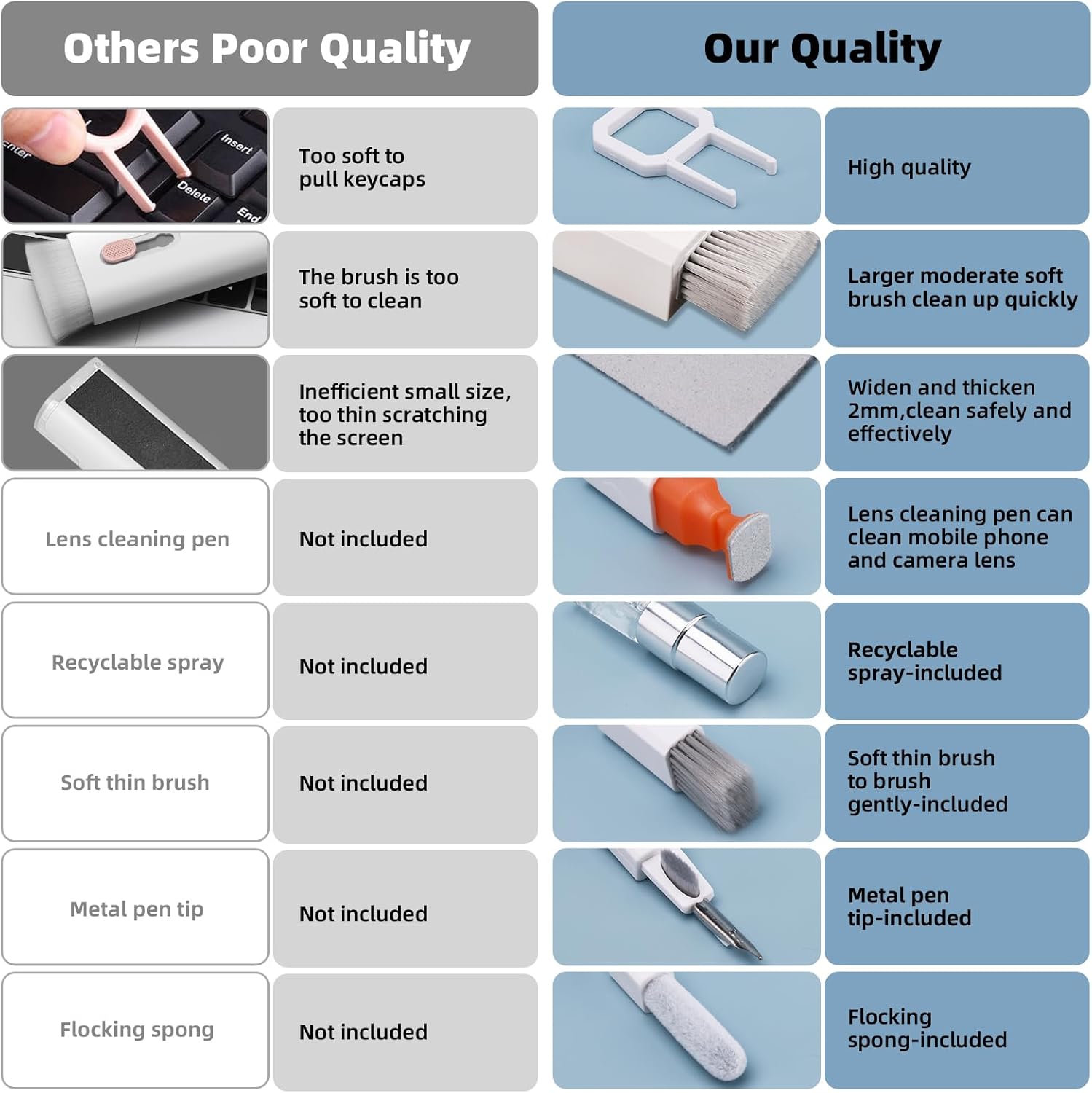 - 【MULTIFUNCTIONAL TOOLS 】Mini soft brush and soft plastic lens cleaning pen are specially designed for DSLR camera screen, lens, and other delicate surfaces. 5 more cleaning cloths of it supplied for replacement. The flocking sponge is an excellent tool for cleaning earbuds charging cases, And the earbud cleaning kit is ideal. This electronic cleaner tool is equivalent to 10 other electronic cleaning kit
