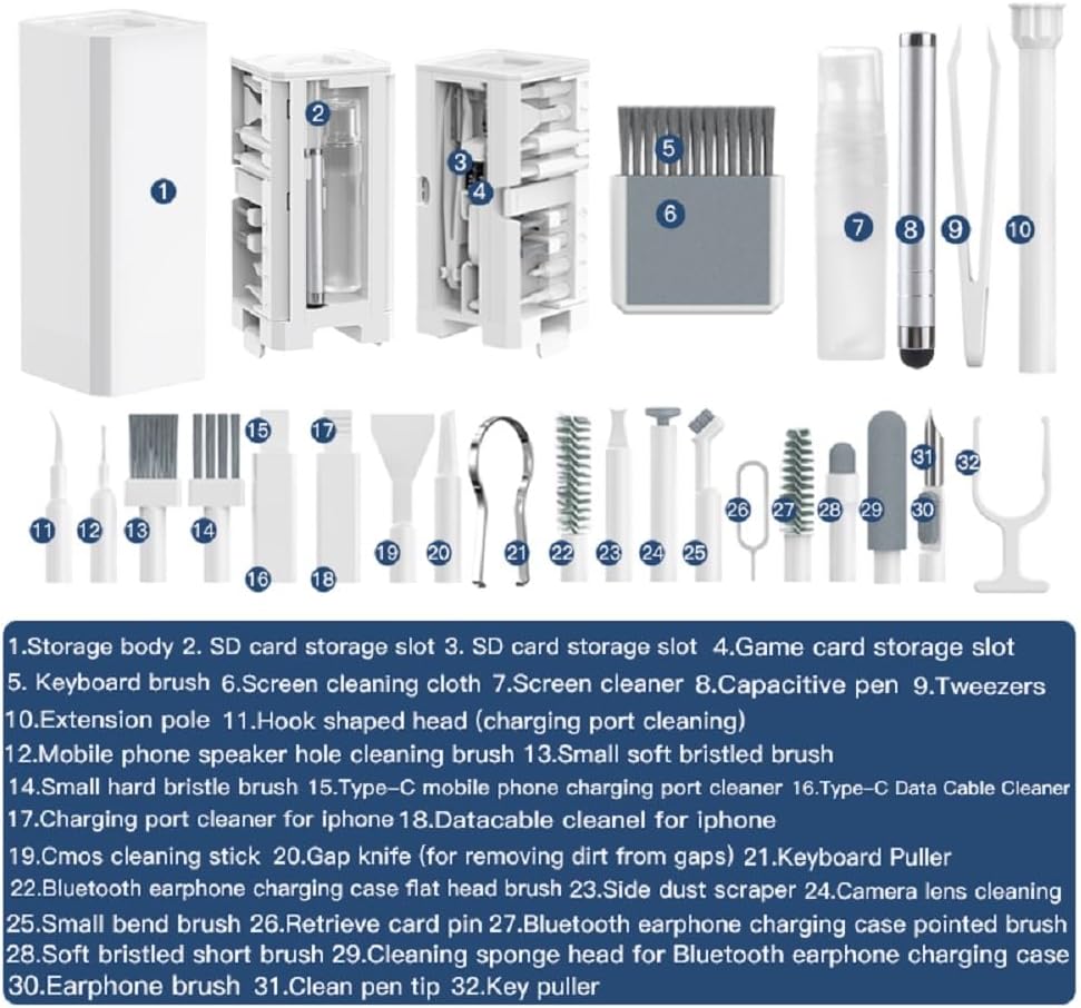 32-in-1 Multi-Function Electronics Cleaning Kit, Computer Laptop Cleaner Kit with Charging Port, Stylus Pen, Keyboard Brush & Reusable Tools for iPhone, MacBook, AirPods, Laptop, Camera Lens