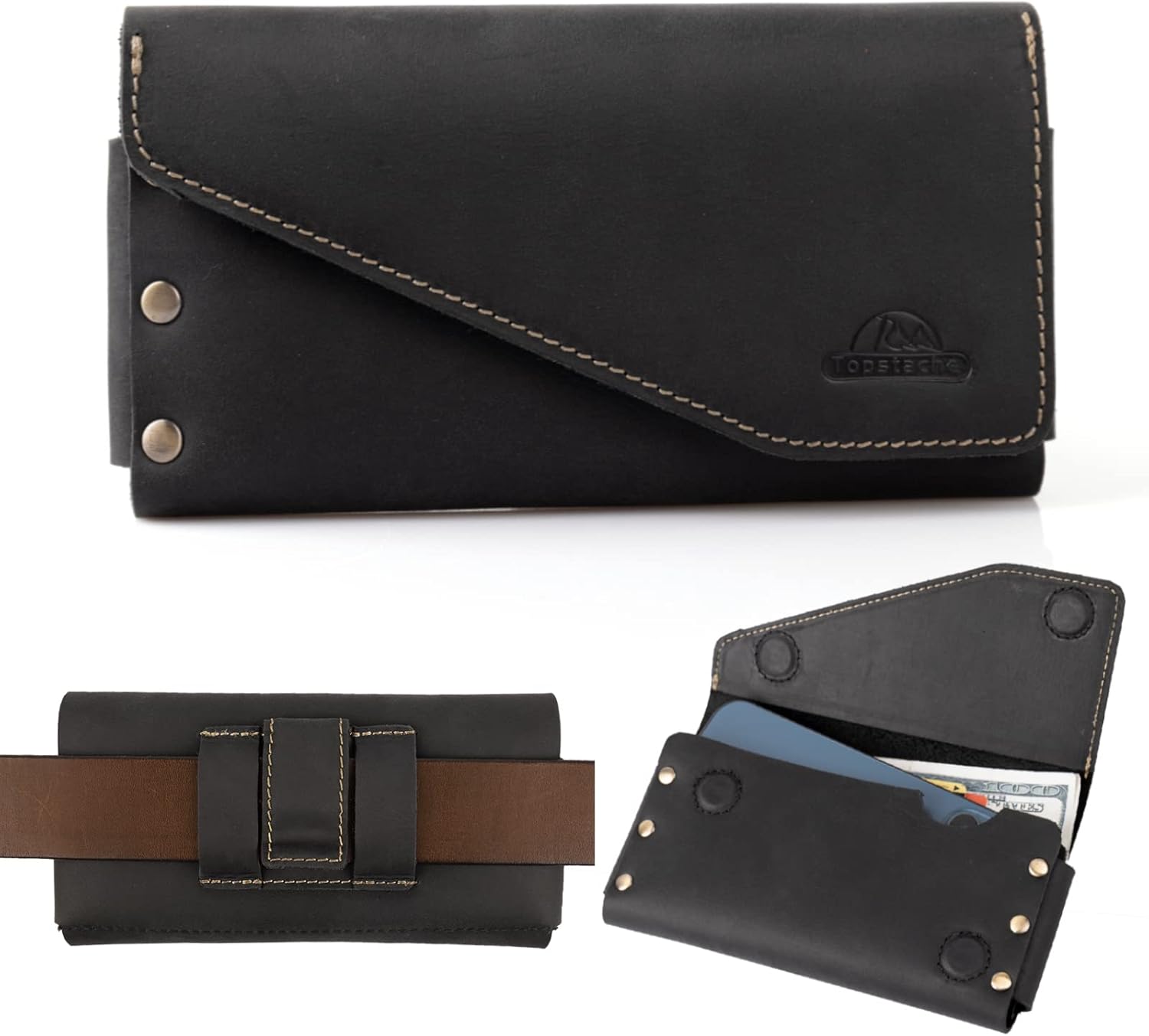 Topstache Leather Phone Holster with Belt Clip for Galaxy S23,S22,iPhone 14,14 Pro,Belt Phone Case for Universal Smartphone with Otterbox Case,Flip Cellphone Pouch,L,Black