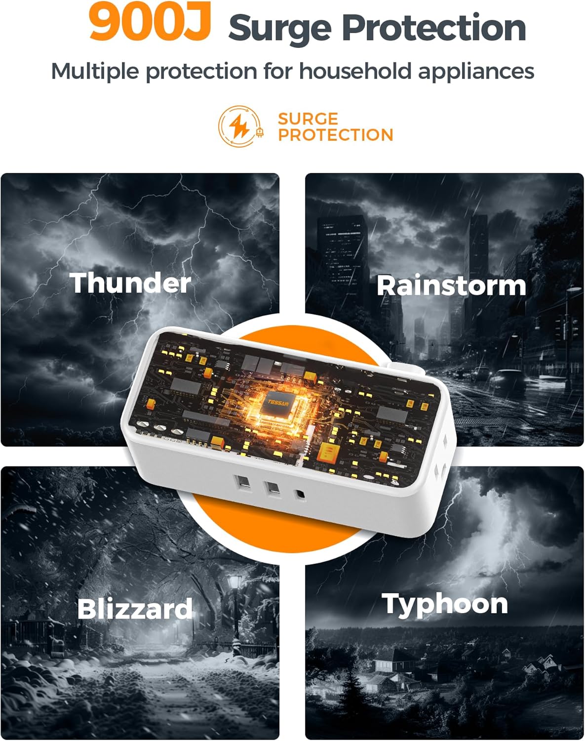 - 900J Surge Protector Outlet: Power strips with surge protection are equipped with short-circuit protection and over-current protection. This long extension cord surge protector can protect your electrical appliances from lighting, surges and spikes