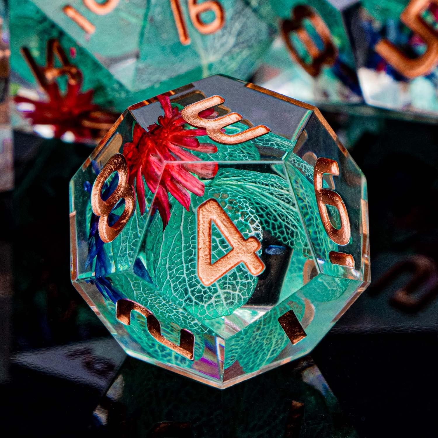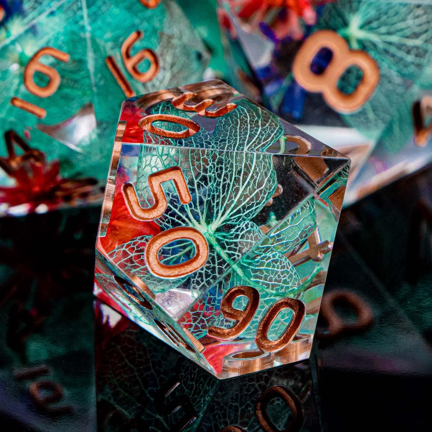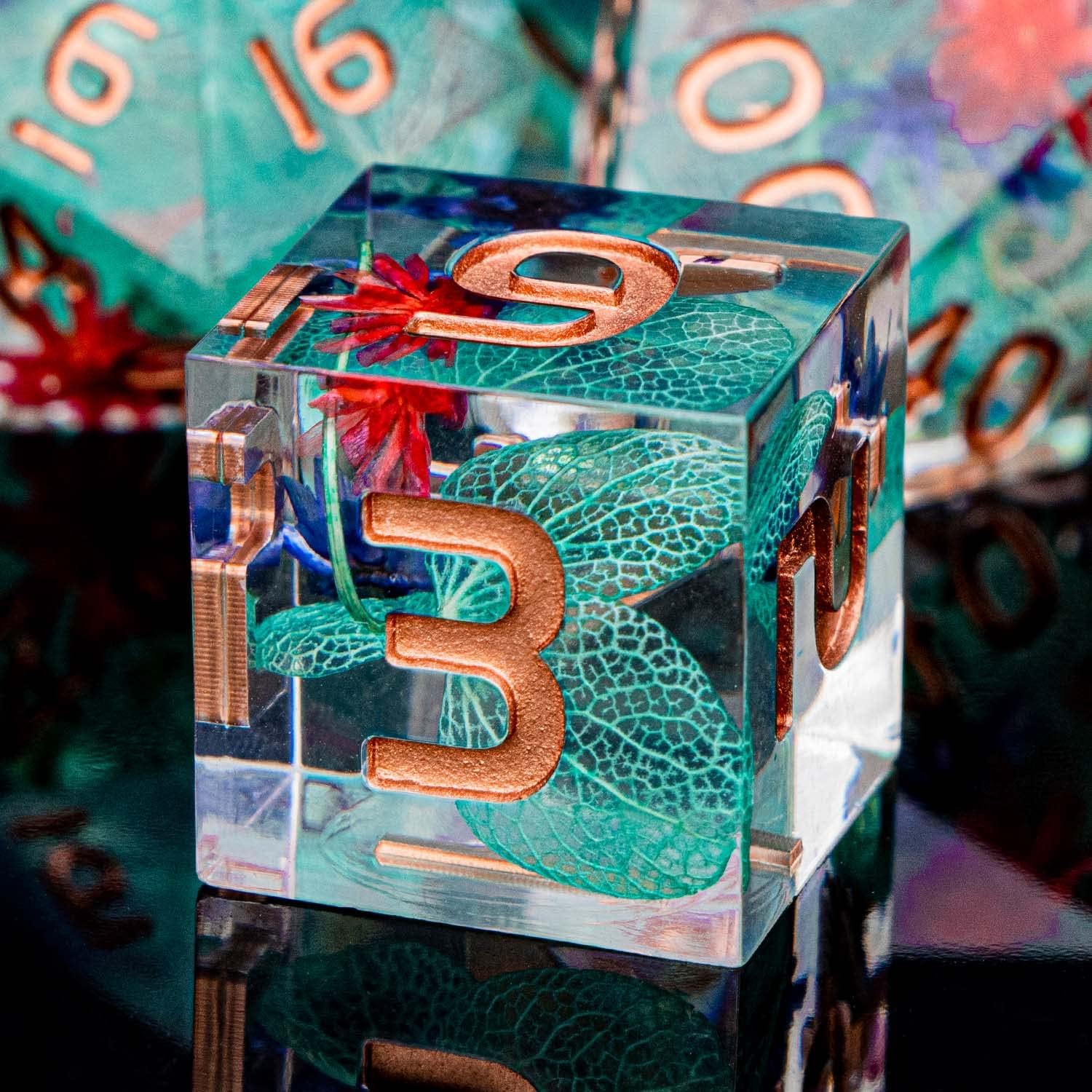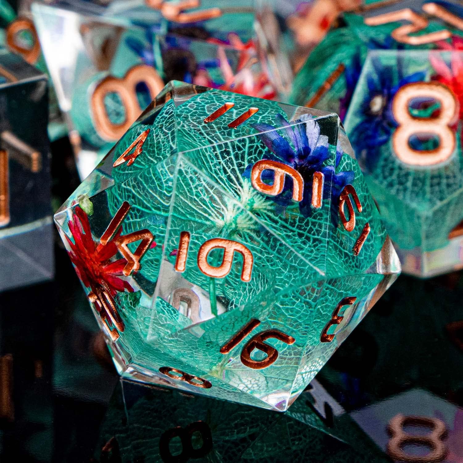 ARUOHHA DND Resin Dice Translucent Green Leaf Sharp Edged Dice Set with Box, 7pcs Flower Inclusions Polyhedral D and D Dice RPG Role Playing Game D20 D12 D10 D6