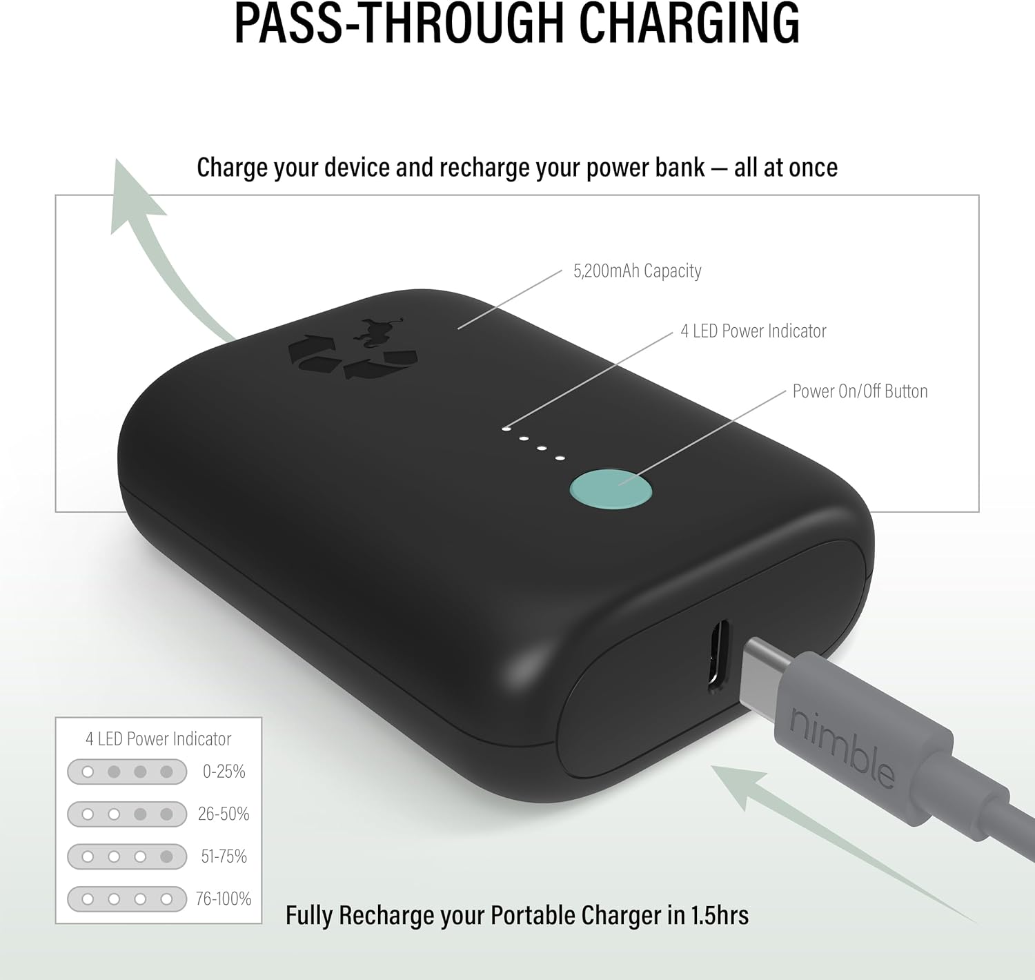Nimble Champ Lite Portable Charger, 5200mAh Fast Charging Power Bank 15W USB C and A Port with Cable, Travel Essential Battery Pack for iPhone Galaxy Pixel MacBook iPad Kindle Airpod Laptop Tablet