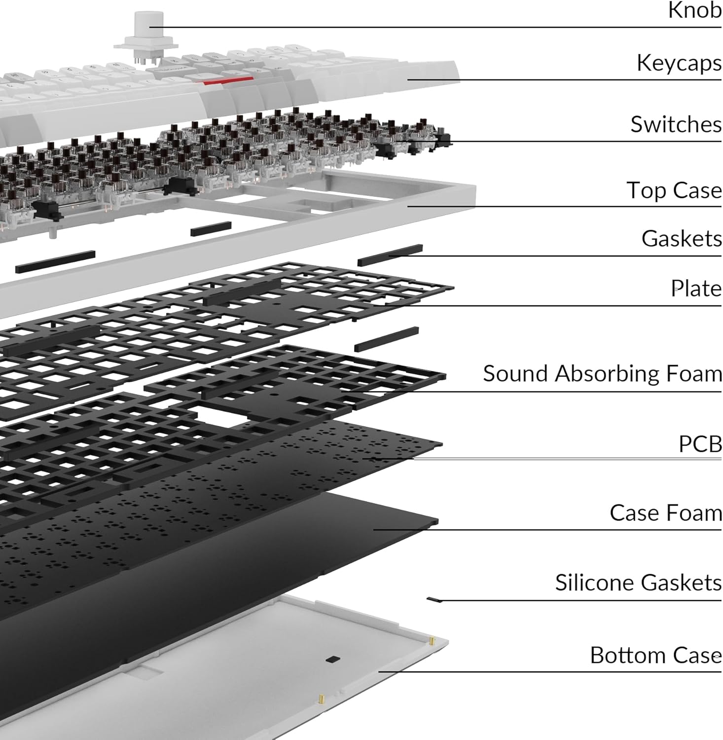 - Double-Gasket Design: In addition to the gaskets on the plates, we added silicone pads between the top and bottom cases to significantly reduce the acoustic resonance between the metals and reduce the noise of the impacted metals. And integrated the PCB-mounted screw-in stabilizers for a smoother typing experience with less wobbliness on the big keys such as the space bar, shift, enter, and delete keys. You can even customize your favorite stabilizers on your own.