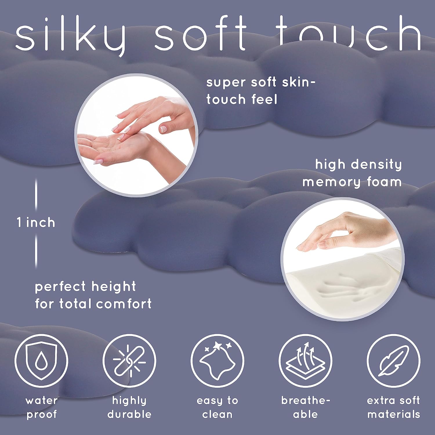 - Cloud Soft Comfort โ The new slate blue cloud wrist rest by Create-ables prioritizes comfort and quality. The outer material of the cloud mouse pad with wrist rest is milk-silk โ a soft, luxurious and biodegradable fabric that is similar in texture to silk and cashmere. Milk-silk is skin-friendly (unlike PU leather made from oil and chemicals) and more durable than most other fabrics