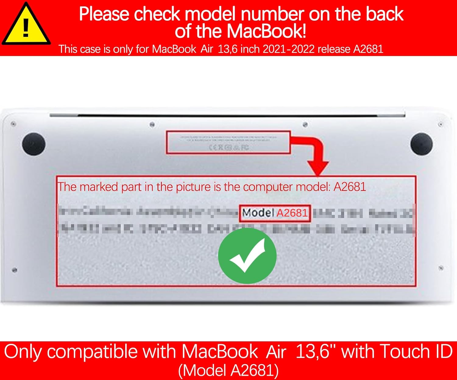 - 【Please kindly】 check the model number "Axxxx" on the back of the laptop before your purchase, make sure you choose the exact same model number as the listing title stated "A3240" or "A3113" or "A2681" WARNING: This case is NOT compatible with other model laptops.