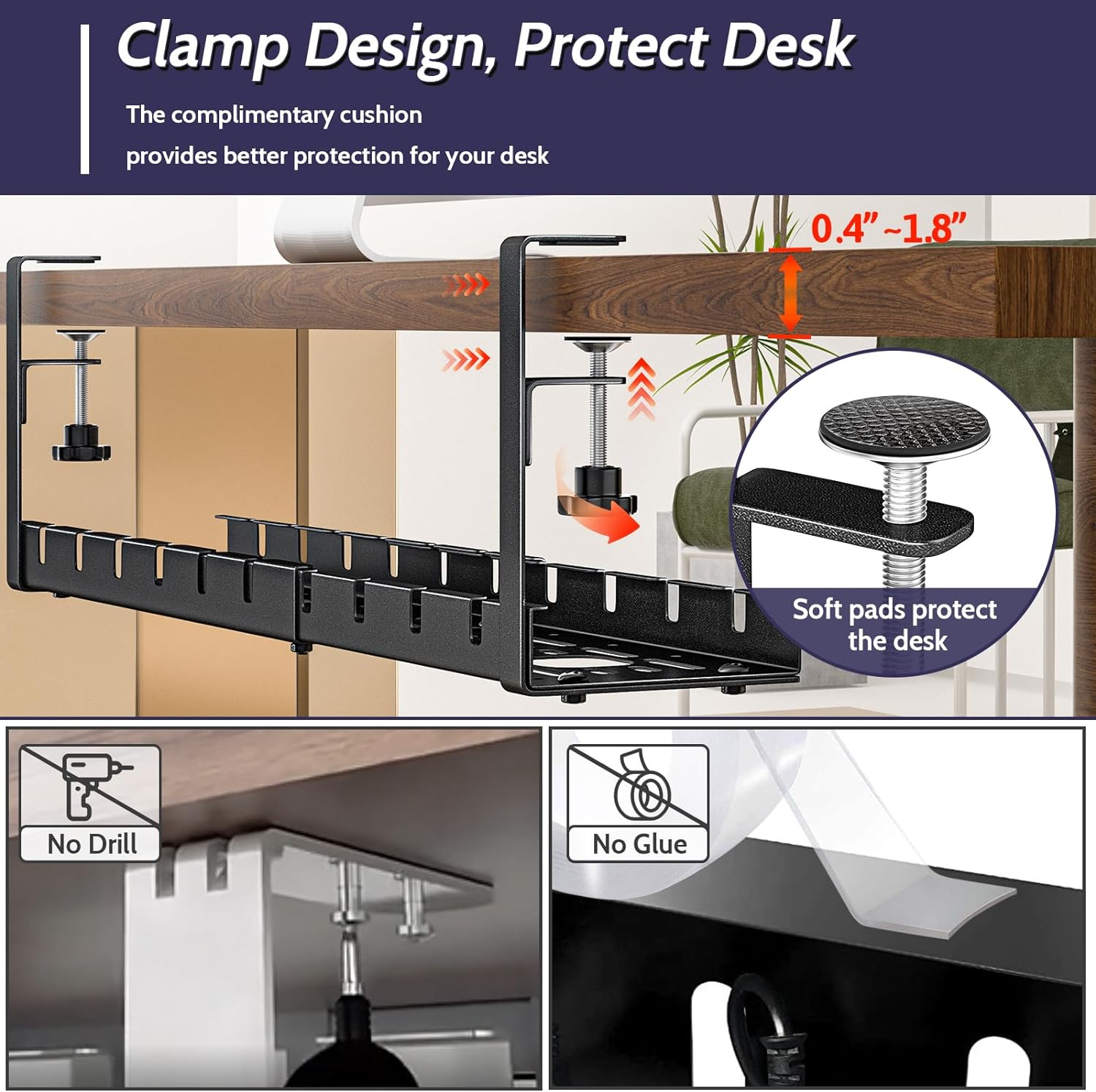 - 【Space Saving】Still putting up with a cluttered and hard-to-clean desktop? Improve the current bad situation by choosing this adjustable, no-drill, easy-to-install and remove under desk cable management. C-clamps with adhesive anti-friction pad are used to hold it in place, eliminating the need for drilling and avoiding damage to the desk.