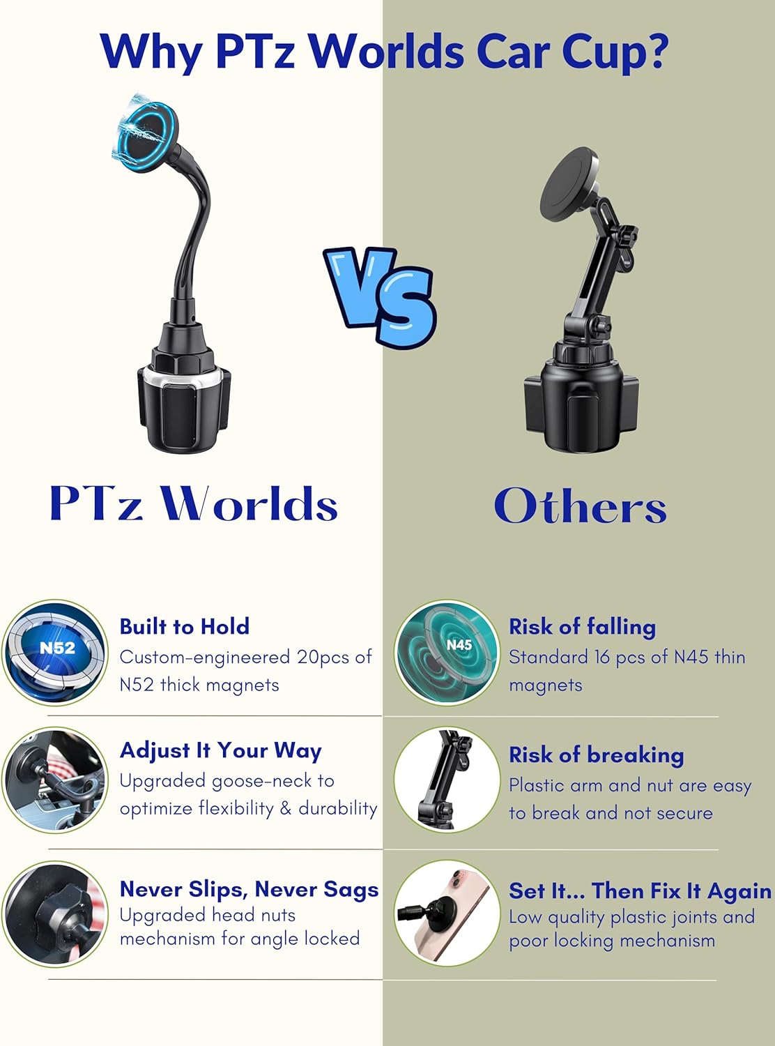- EXPERIENCE UNMATCHED MAGNETIC STRENGTH - Custom-engineered with 20-PCS N52 magnets, our Cup Phone Holder for Car securely holds your phone in place, no matter how bumpy the ride gets.