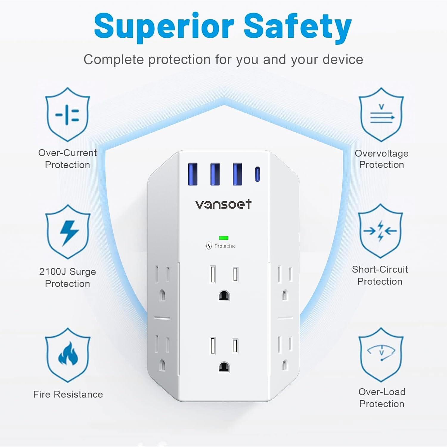 Outlet Extender, Vansoet 6 Outlet Splitter with 4 USB Ports(1 USB C PD 20W), 2100J Surge Protector Power Strip, 3 Side Multi Plug Outlet for Travel, Home, Office, Dorm