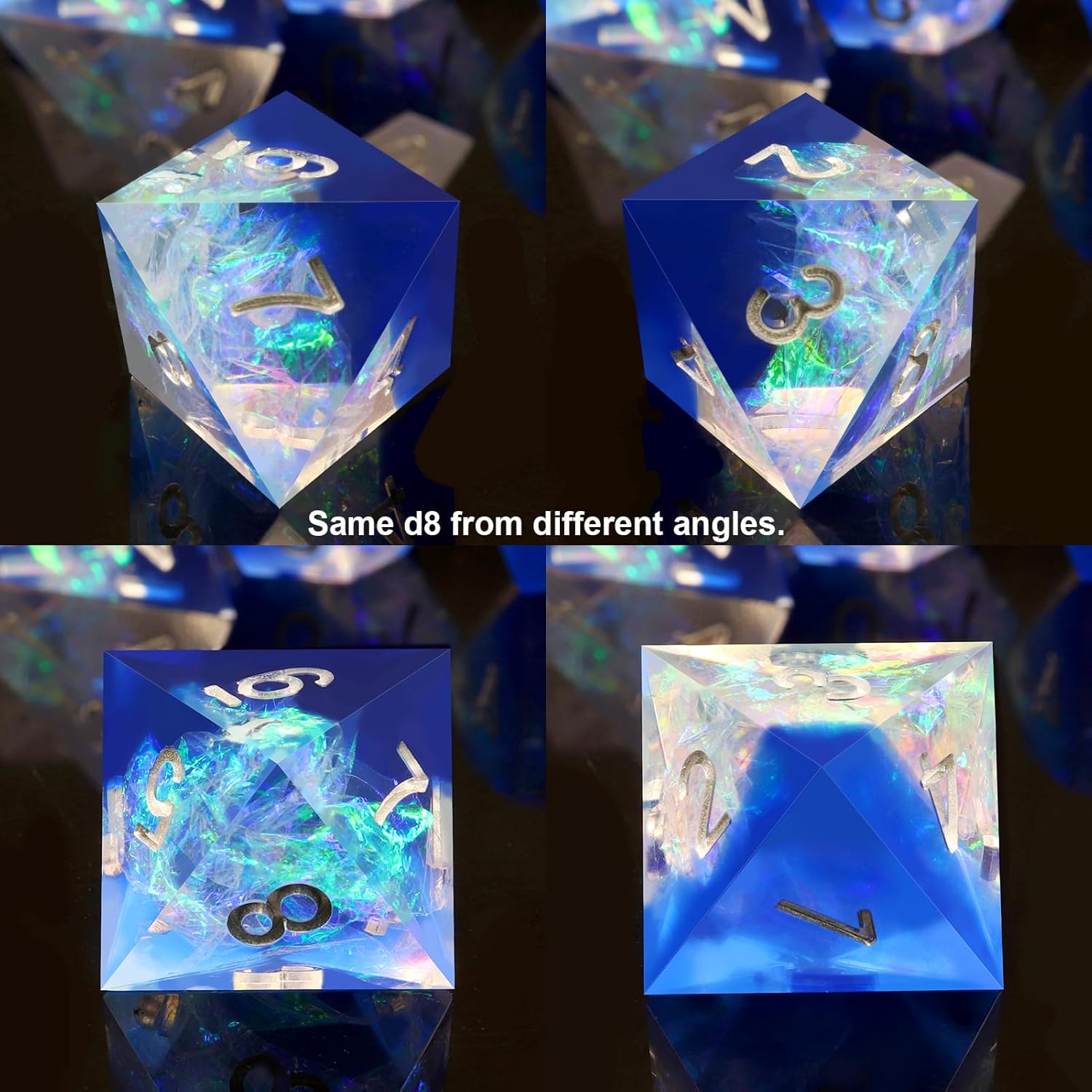 - Handmade Quality Resin Dice Set: The cold blue sharp edge dice set displays sparkling lights mimicking splendid cosmic lights. All dice are crafted by our experienced resin aristists and hand picked to be visually perfect before shipping. Surfaces are polished to be mirror level. As they are handmade, each set will vary slightly in color proportions and inclusion placement.
