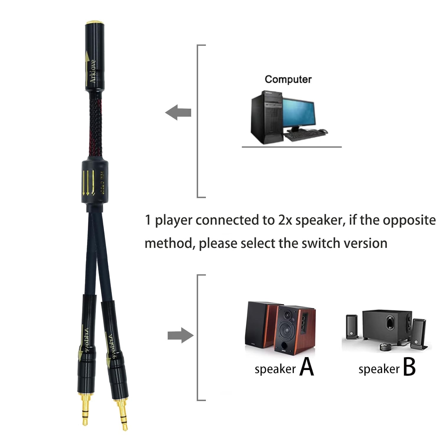 Arklove 20ft Shielded 1/8" aux Input 3.5mm Female to 2X 3.5 Output Splitter Stereo Audio Video Cable Out 3.5 Male to Two 3.5 Male in Dual 2 Speaker Cord 24k Gold Plated