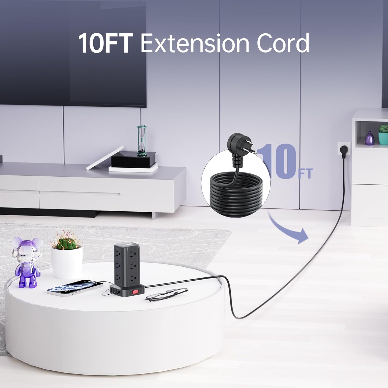 - 【16 IN 1 Surge Protector Tower with USB】- This power strip tower surge protector with 12 AC outlets and 4 smart USB can power up to 16 electronic devices simultaneously. Integrated circuit breaker and 1200 Joules protection rating ensure the safety of your electronics.