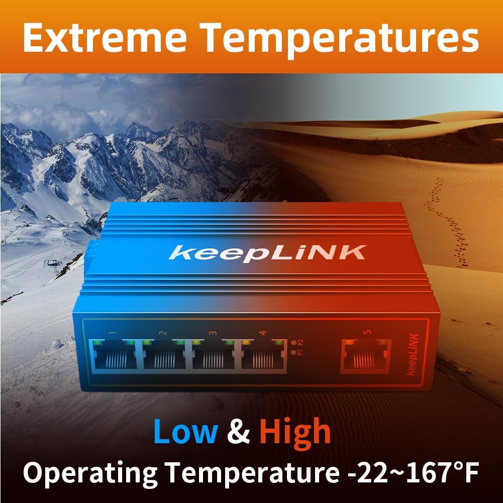 - Extreme temperature Switch: the metal hardened IP40 rated network switch is equipped with a rugged IP40 rated enclosure and designed to withstand a high degree of vibration, shock, while operating with a wide temperature range (-30 ~ 75 °C (-22 ~ 167 °F) For harsh environments.