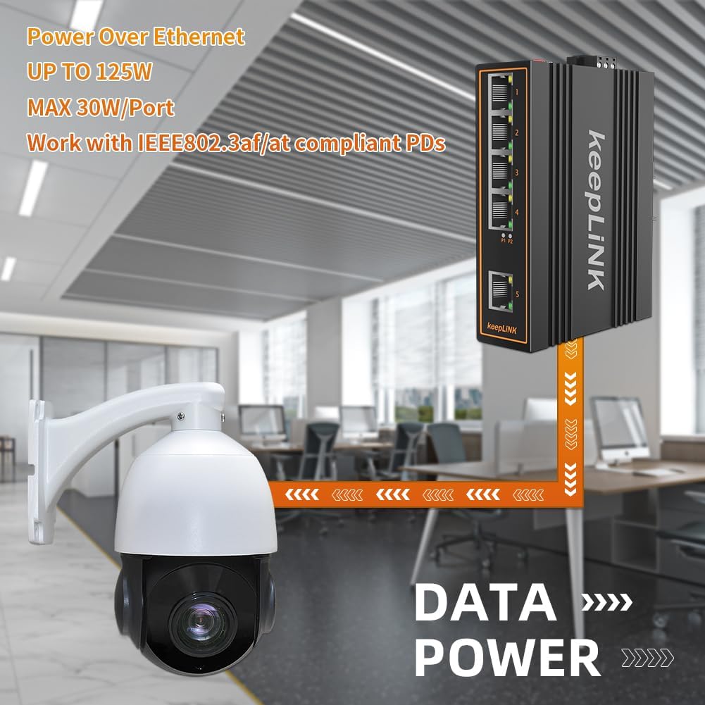 - 100Mbps PoE Switch: keepLiNK 5 ports industrial ethernet switch have 4 10/100Mbps PoE+ ports, 1 100Mbps uplink. Total power 125W, max power per port 30W.