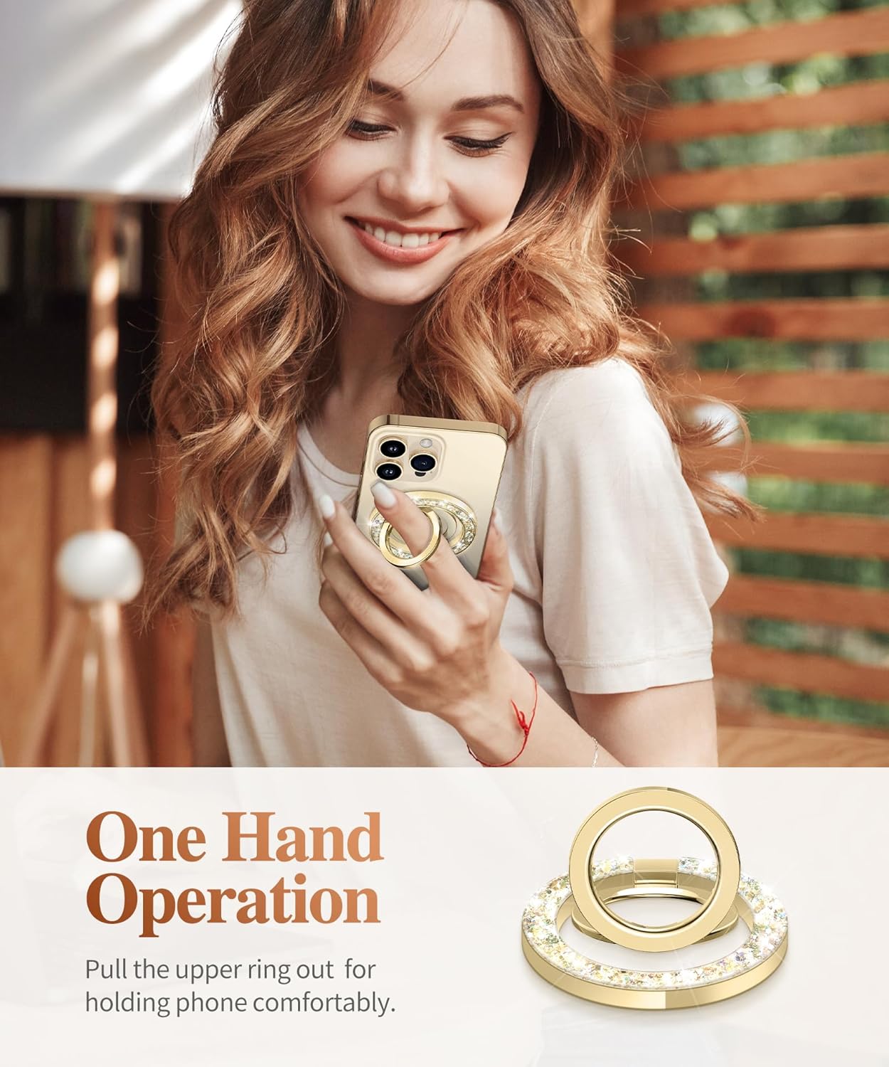 - [Premium & Comfortable Grip] The cell phone stand is made of high-quality zinc alloy metal material with electroplated coating that offers ultra-durability and unfading colors. Shiny crystal base adds style to your phone case. This ring is more ergonomically designed for a comfortable and secure grip. Perfectly adapted to various occasions of one-handed use, avoid phone drops.