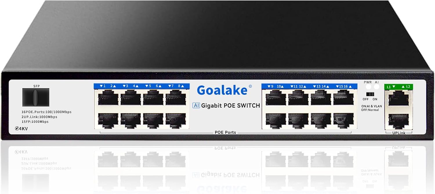 - AI extendtion: The AI function further extends the reach of powered devices by enabling data and power transmission up to 250 meters. This makes the Goalake PoE switch ideal for large-scale deployments such as surveillance systems and expansive network setups.