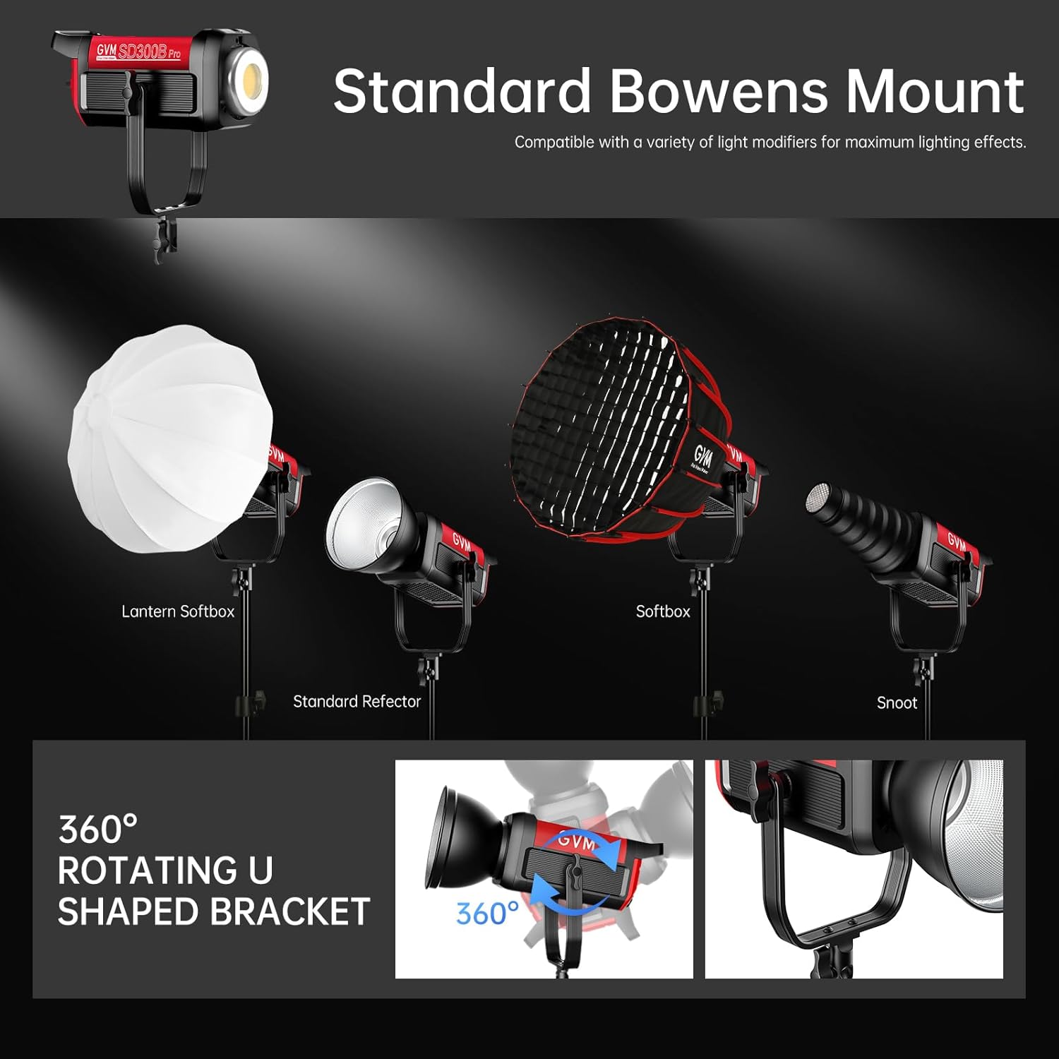 - STANDARD BOWENS MOUNT AND SHIPPING BOX: Photography light Designed with Bowens Mount, Compatible with a great variety of light modifiers, including softboxes, reflectors, beauty dishes, snoots, and more. 360° ROTATING U SHAPED BRACKET and lets you easily adjust the light angles. GVM-SD300B LED Video Light comes with a SHIPPING BOX, the included foam padding effectively protects the light body and accessories for easy transport and safe storage, easy to carry for outdoor shooting.