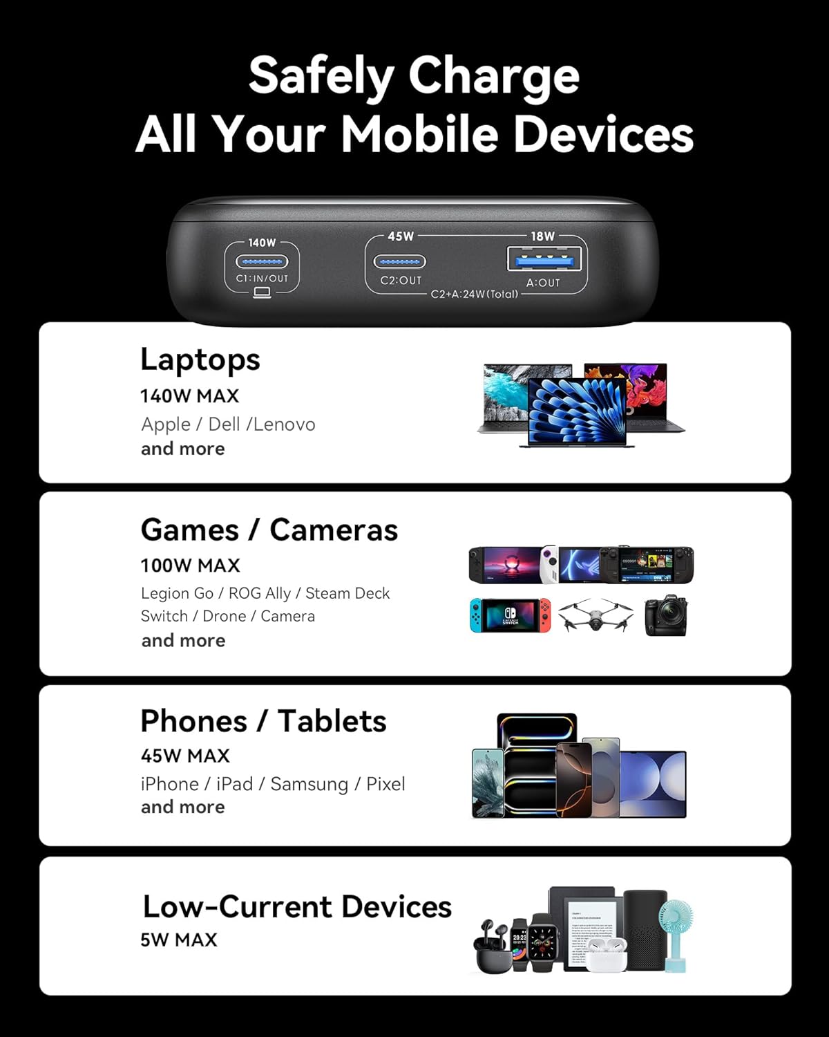 - 140W Wider Compatibility: 140W high-power with 2 USB-C and 1 USB-A ports can charge high-performance laptops, cameras, drones, Vision Pro, Steam Deck, projectors, and more, as well as daily smartphones. It also adapts to low-power devices.