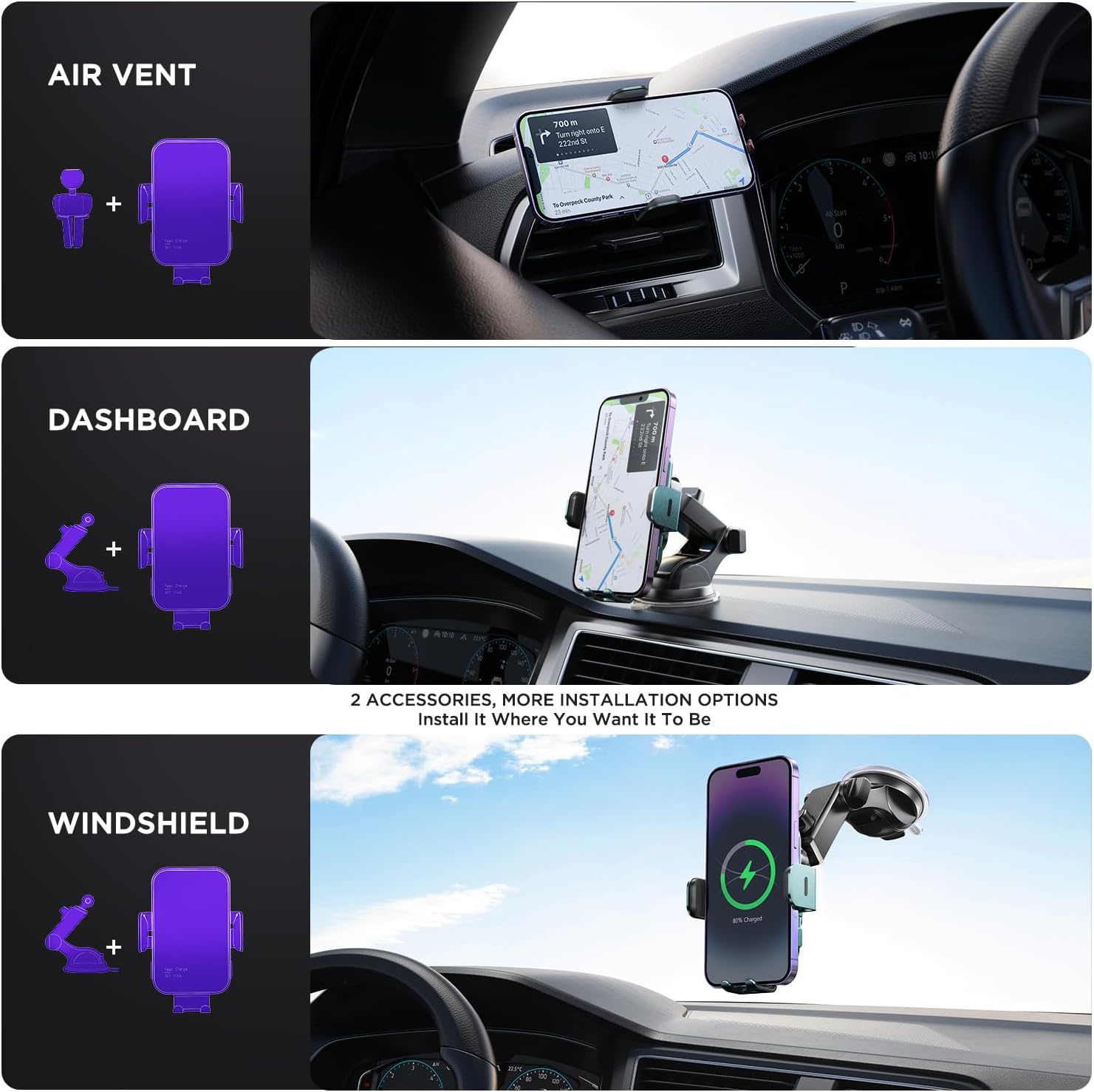 - 【TWO ACCESSORIES, MULTIPLE MOUNTING OPTIONS】Comes with suction cup and vent clips, the cell phone car mount has several installation methods to stick on the windshield, dashboard, vent or the most flat surfaces. Ideal accessories for most cars, vehicles, pickup, trucks, SUVs and taxis. It is also a travel essentials / gift for Uber, Lyft and kharly drivers