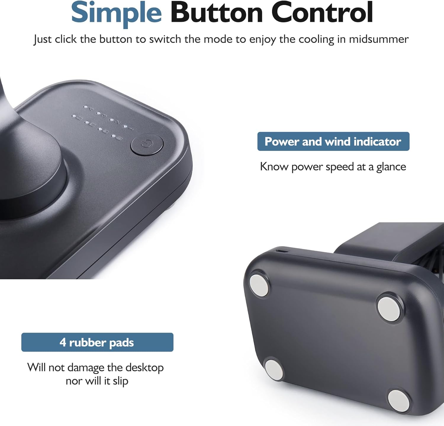 - 【Battery Fan】To accommodate your needs, the table fan features 4 speeds for optimal airflow and comfort. Press the button on the base to change the speed level as you want. And it will show the battery capacity while working.