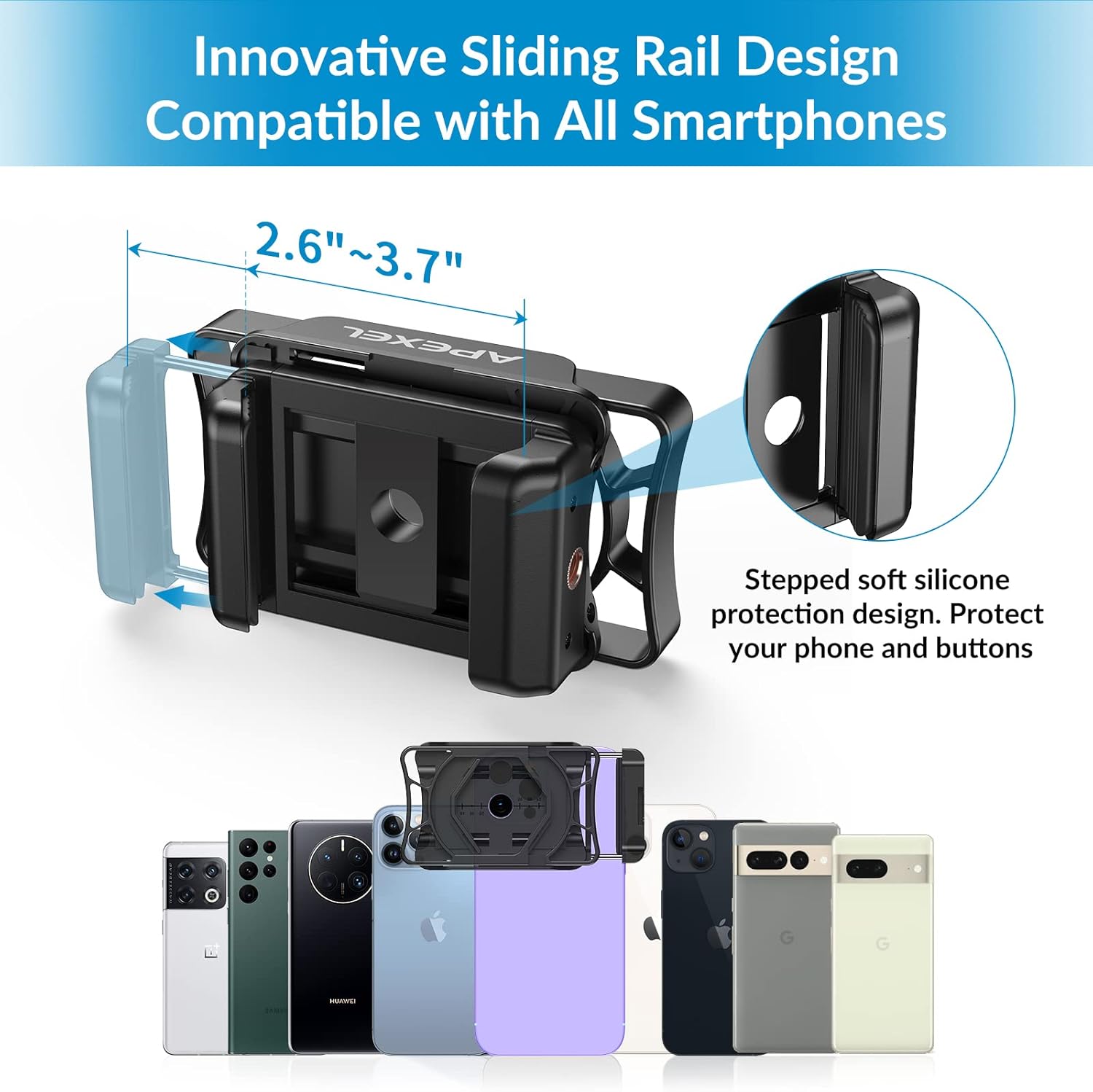 - 【3-Step Installation in 5s】 APEXEL telescope phone adapter adopts a revolutionary fixing method. The one-piece slide rail and stretch clip design, can complete the 3-step installation in 5 seconds without fuss. It also includes a bluetooth shutter remote, capture moments effortlessly with just a click.