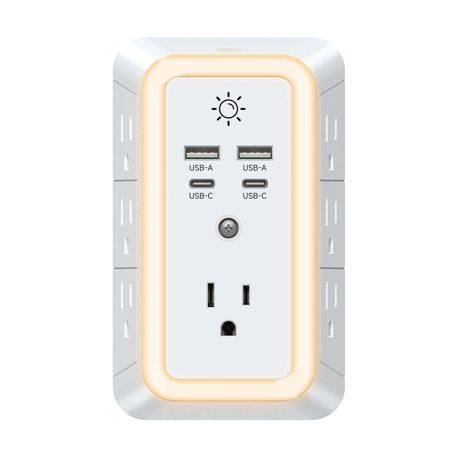 - 【Smart & Soft Night Light】 LED night light around the edges,Dusk-To-Dawn sensor, With the light sensor, the outlet extender will automatically turns on only when ambient lighting becomes dim, The night light is soft, warm and comfortable, the outlet extender will automatically turns on only when ambient lighting becomes dim
