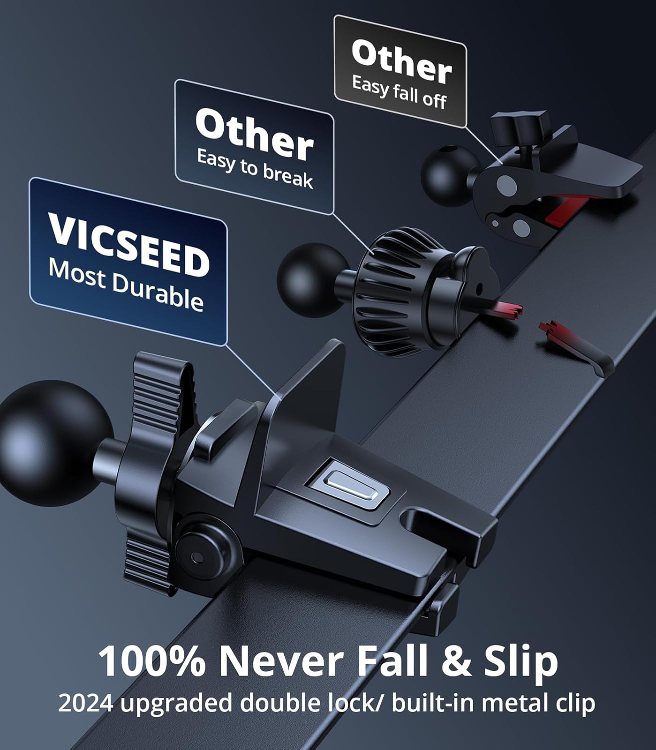 - [Ultimate Air Vent Clip] Compared with other vent clips on the market, VICSEED MagSafe car mount's vent clip stands out. ①Most Stable: Coming with the latest improved “Anti-move baffle + Double lock mechanism + built-in metal" - [Won't Fall Off/Broken] ②Most Universal: Adjustable opening makes this cell phone holder car vent fit for 99% vents ③Most Safe: The soft silicone on the vent clip can hold the vent phone mount for car more stably and protect vent blade from being scratched or deform