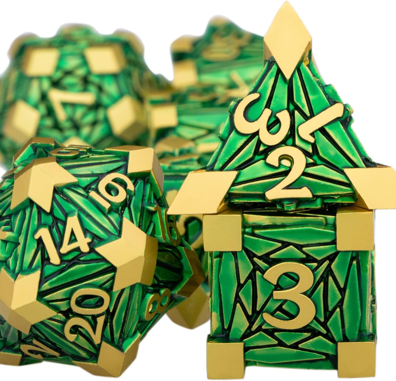 Metal DND Dice Set with Box, Debris RPG Green Golden D and D Dice for use with D&D Tabletop Games Role Playing Game Polyhedral Dice Set D20 D12 D10 D8 D6 D4
