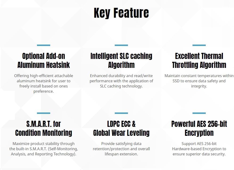 - Special Feature : Excellent Thermal Throttling Algorithm: Maintain constant temperatures within SSD to ensure data safety and integrity., Intelligent SLC caching Algorithm: Enhanced durability and read/write performance with the application of SLC caching technology., Optional Add-on Aluminum Heatsink: Offering high-efficient attachable aluminum heatsink for user to freely install based on ones preference., Powerful AES 256-bit Encryption: Support AES 256-bit Hardware-based Encryption to ensure superior data security., S.M.A.R.T. for Condition Monitoring: Maximize product stability through the built-in S.M.A.R.T. (Self-Monitoring, Analysis, and Reporting Technology). Excellent Thermal Throttling Algorithm: Maintain constant temperatures within SSD to ensure data safety and integrity., Intelligent SLC caching Algorithm: Enhanced durability and read/write performance with the application of SLC⌠See more