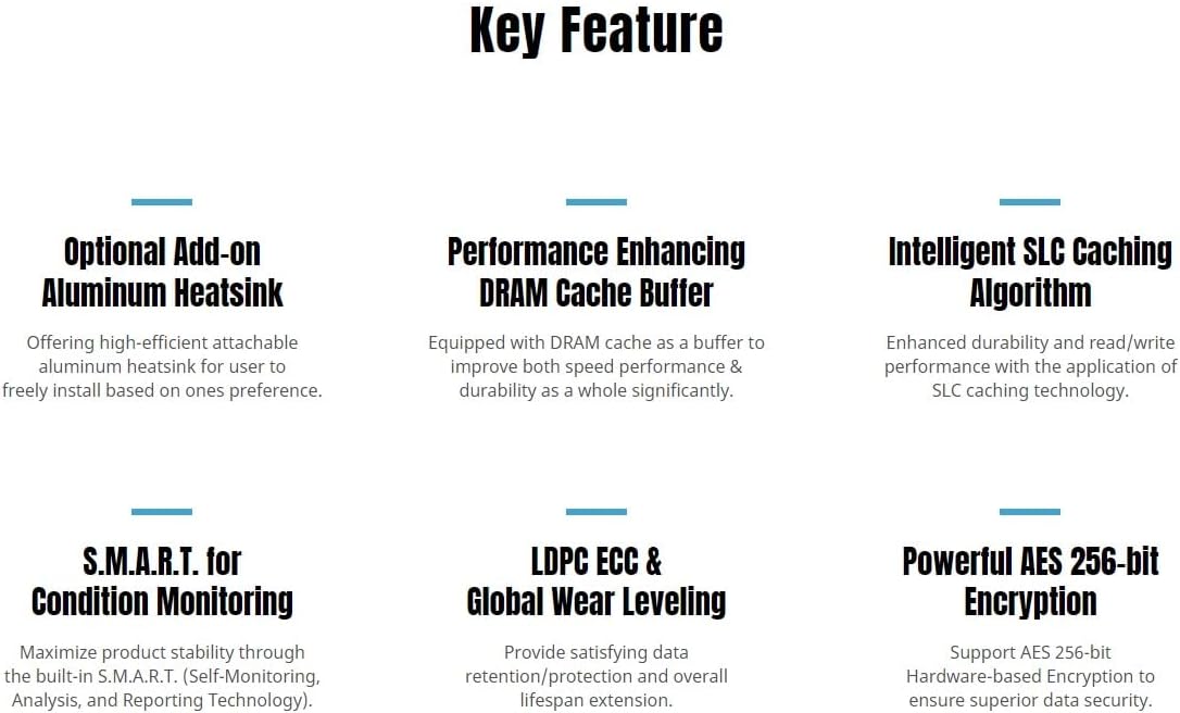 - Special Feature : Intelligent SLC Caching Algorithm: Enhanced durability and read/write performance with the application of SLC caching technology., Optional Add-on Aluminum Heatsink: Offering high-efficient attachable aluminum heatsink for user to freely install based on ones preference., Performance Enhancing DRAM Cache Buffer: Equipped with DRAM cache as a buffer to improve both speed performance & durability as a whole significantly., Powerful AES 256-bit Encryption: Support AES 256-bit Hardware-based Encryption to ensure superior data security., S.M.A.R.T. for Condition Monitoring: Maximize product stability through the built-in S.M.A.R.T. (Self-Monitoring, Analysis, and Reporting Technology). Intelligent SLC Caching Algorithm: Enhanced durability and read/write performance with the application of SLC caching technology., Optional Add-on Aluminum Heatsink: Offering high-efficient attachable aluminum heatsink fo… See more