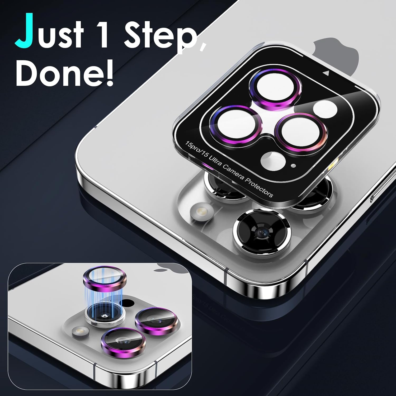 - One-step Installation: The camera lens protector for iPhone 15 Pro is embedded in an acrylic positioning frame, just use our cleaning accessories to clean the lens, tear off the back protective film, align the camera lens and remove the positioning tray, the installation is done. All 3 individual camera lens covers are installed successfully at the same time, which is a very simple and considerate installation design. No bubbles and the lens cover will stick tightly for a perfect fit.