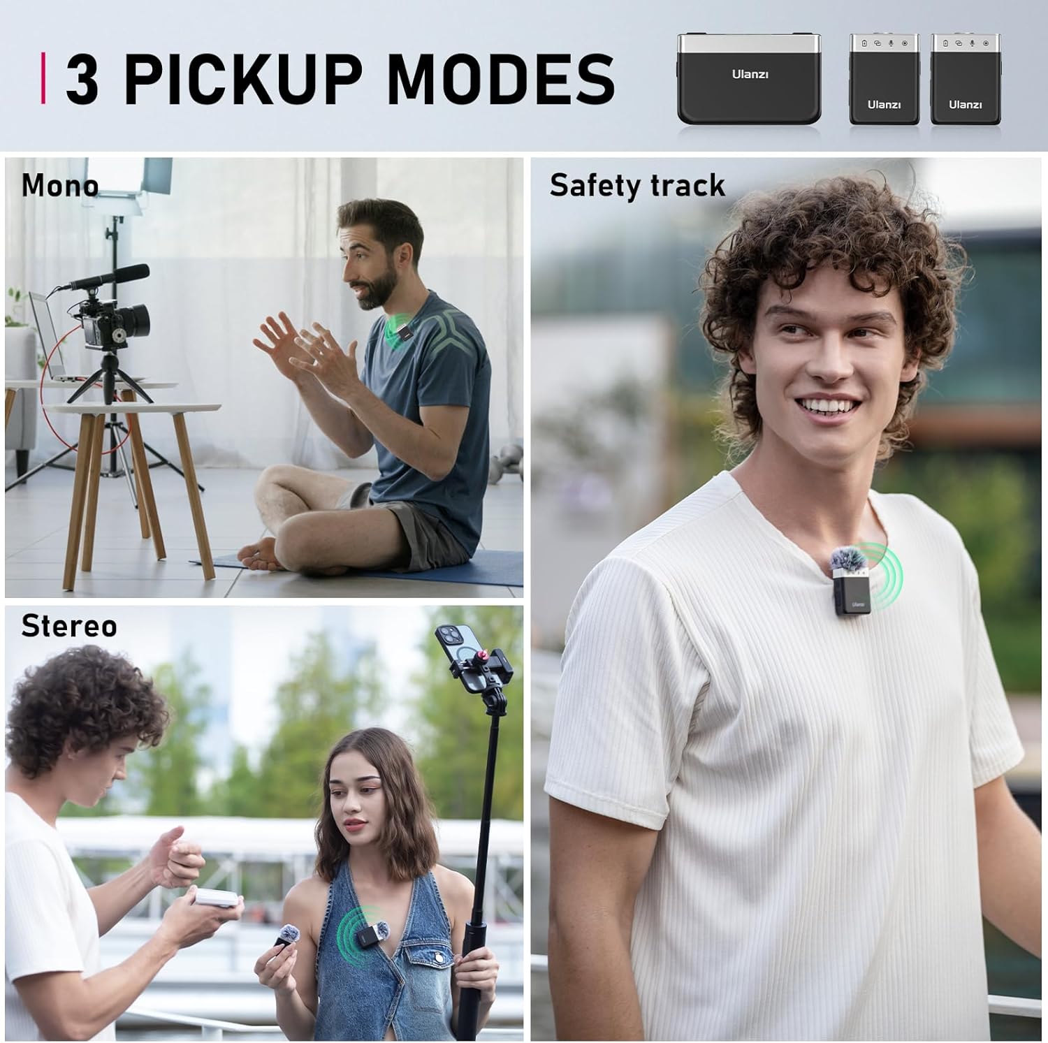 - ăHigh-Quality AudioăUlanzi wireless lapel microphone comes with a 48kHz sampling rate, capturing every detail and nuance with stunning clarity. Features Three pickup modes - Mono Mode: Accurate frequencies, clear and distortion-free. Stereo Mode: High-fidelity and immersive, professional audio. Safety Track Mode: Backup audio track, helping to safeguard your audio in case of unforeseen level spikes.