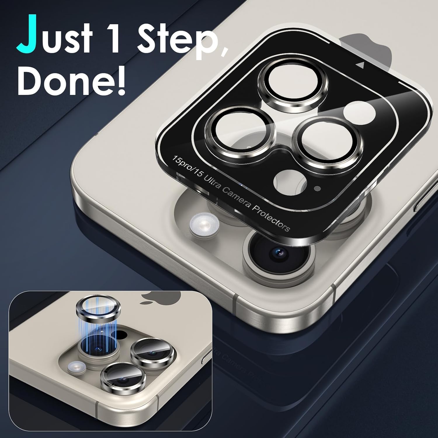 - [One-step installation] The camera lens protector for iPhone 15 Pro is embedded in an acrylic positioning frame, just use our cleaning accessories to clean the lens, tear off the back protective film, align the camera lens and remove the positioning tray, the installation is done. All 3 individual camera lens covers are installed successfully at the same time, which is a very simple and considerate installation design. No bubbles and the lens cover will stick tightly for a perfect fit.