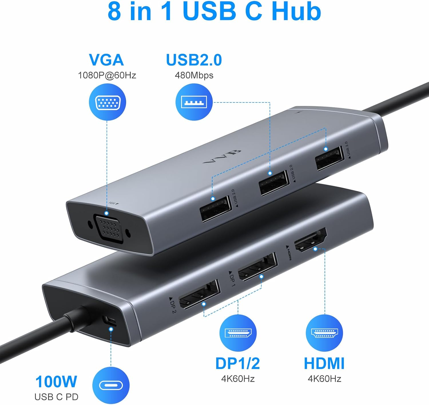 - USB C Docking Station 8 IN 1: This usb c hub can easily expand your laptop from one type c/thunderbolt 3/4 port into 8 ports: 2 DisplayPorts(4K@30Hz), HDMI(4K@60Hz), VGA(1080P@60Hz),3 USB 2.0 ports(480Mbps) and 1 USB C PD charging port(100W).No need any drivers or software, just plug and play.NOTE: This docking station compatible with laptops with a Full-featured USB C port (with vidieo out put function). And the display port usb c adapter Not Support Using Converter