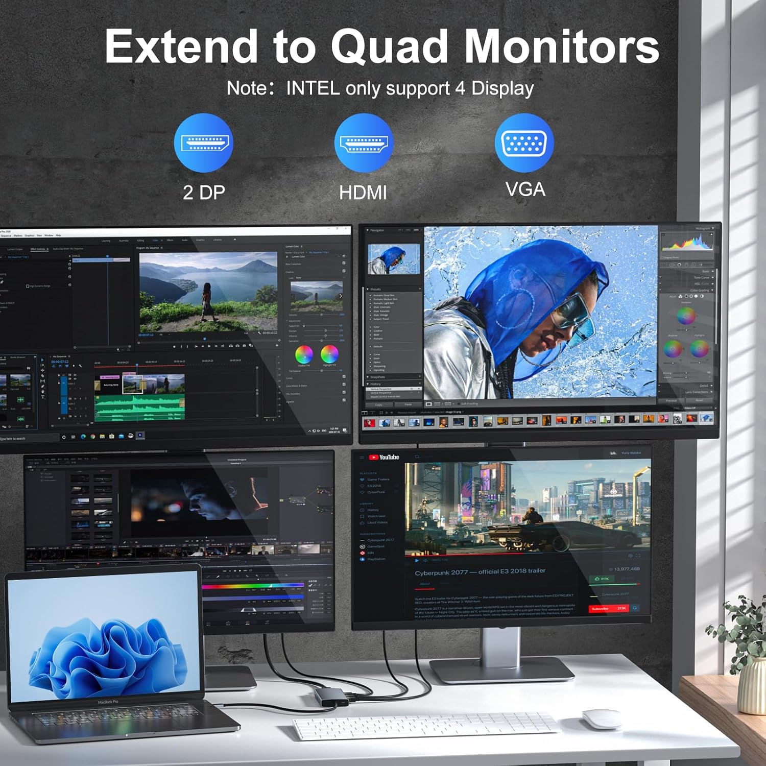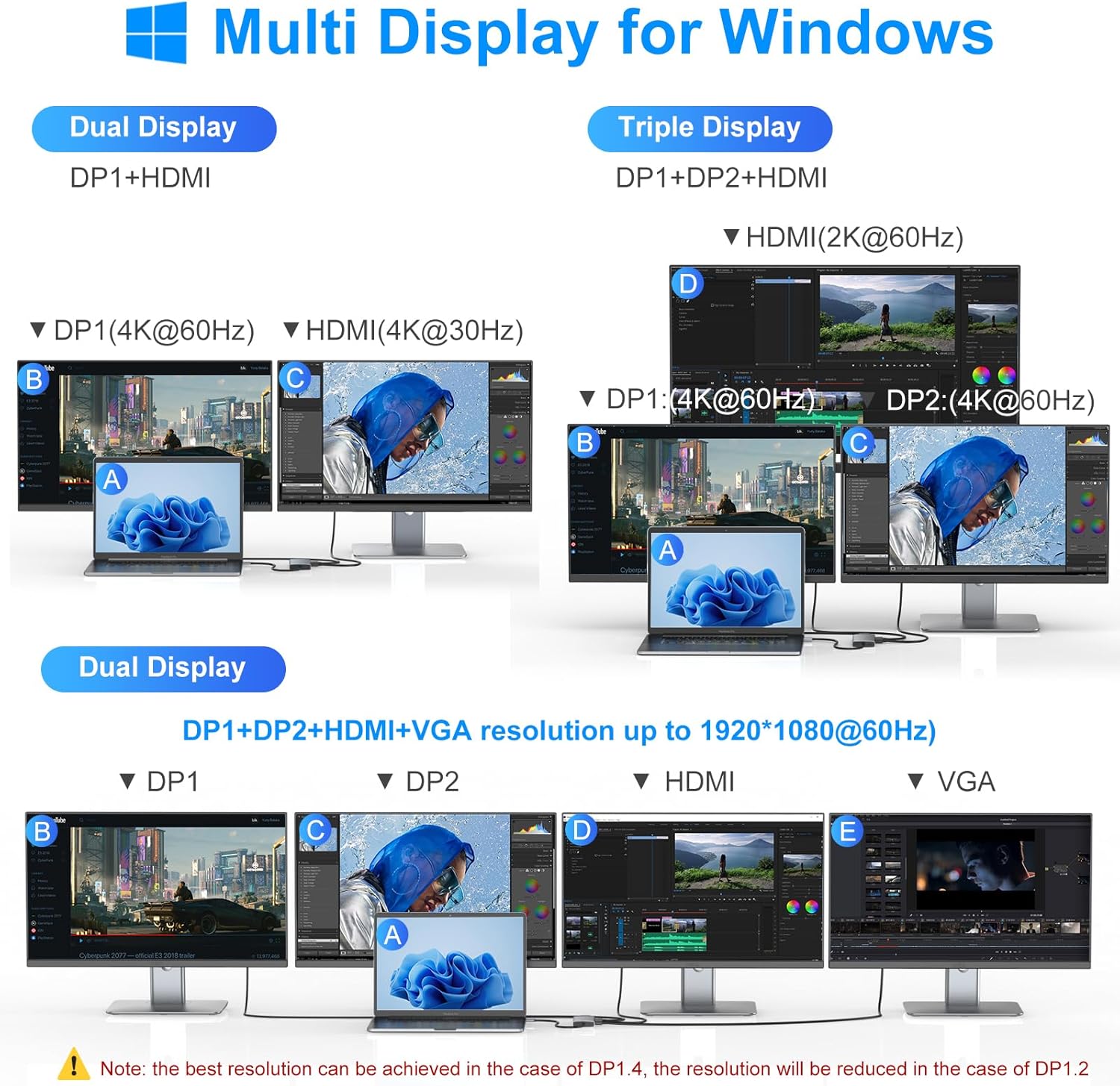- Dual and Triple 4K Display Multiple Adapter: This docking station dual monitor can easily achieve dual monitors,triple displays and quad monitors for Windows laptop.While single use HDMI/DP1/2resolution up to 【4K@60Hz, single use VGA resolution up to 1080@60Hz. When using DP1/2+HDMI, dual monitors will be 4K@60Hz and 4K@30Hz(DP1.4); When using HDMI+DP1+DP2, triple monitors will be 2*4K@60Hz+2K@60Hz (DP1.4); Display output will be 1080P when quadruple displays and multiple monitors with VGA