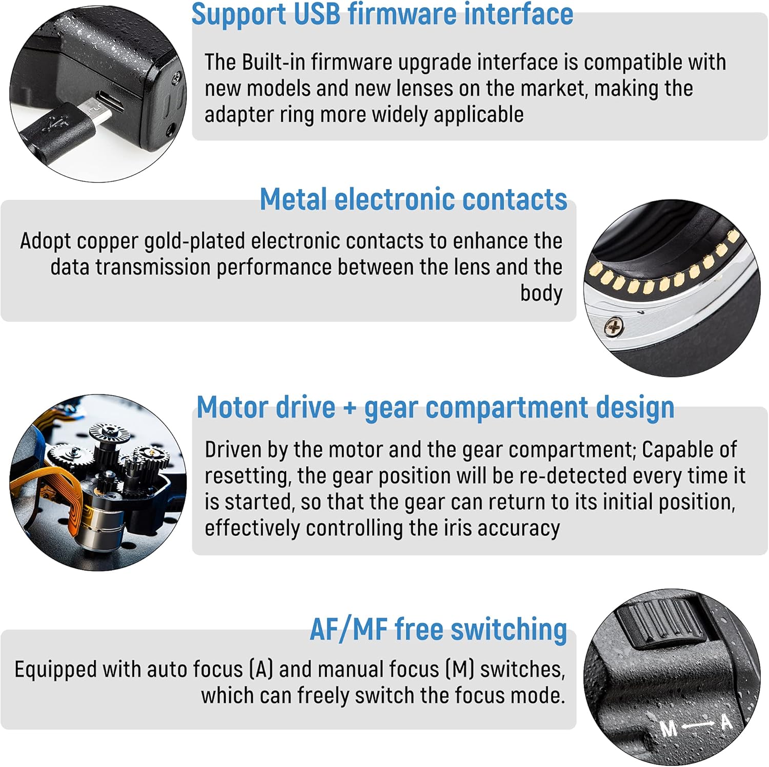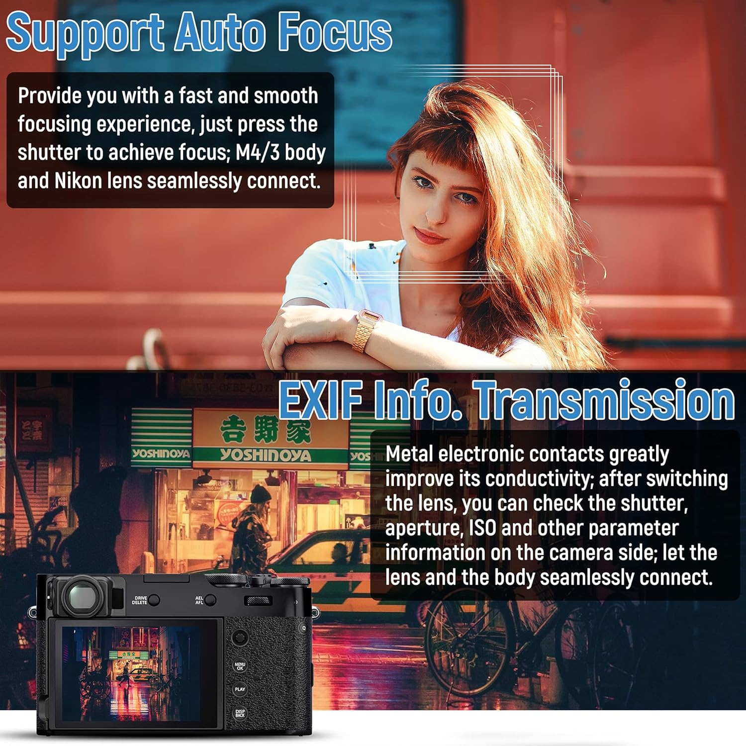 - AF Function: The NF-M1 adapter support auto-focusing. In continuous focusing and eye auto-focusing, it can maintain the performance just like native glass adapters. Track objects quickly and a handy design for the switch of AF/MF.