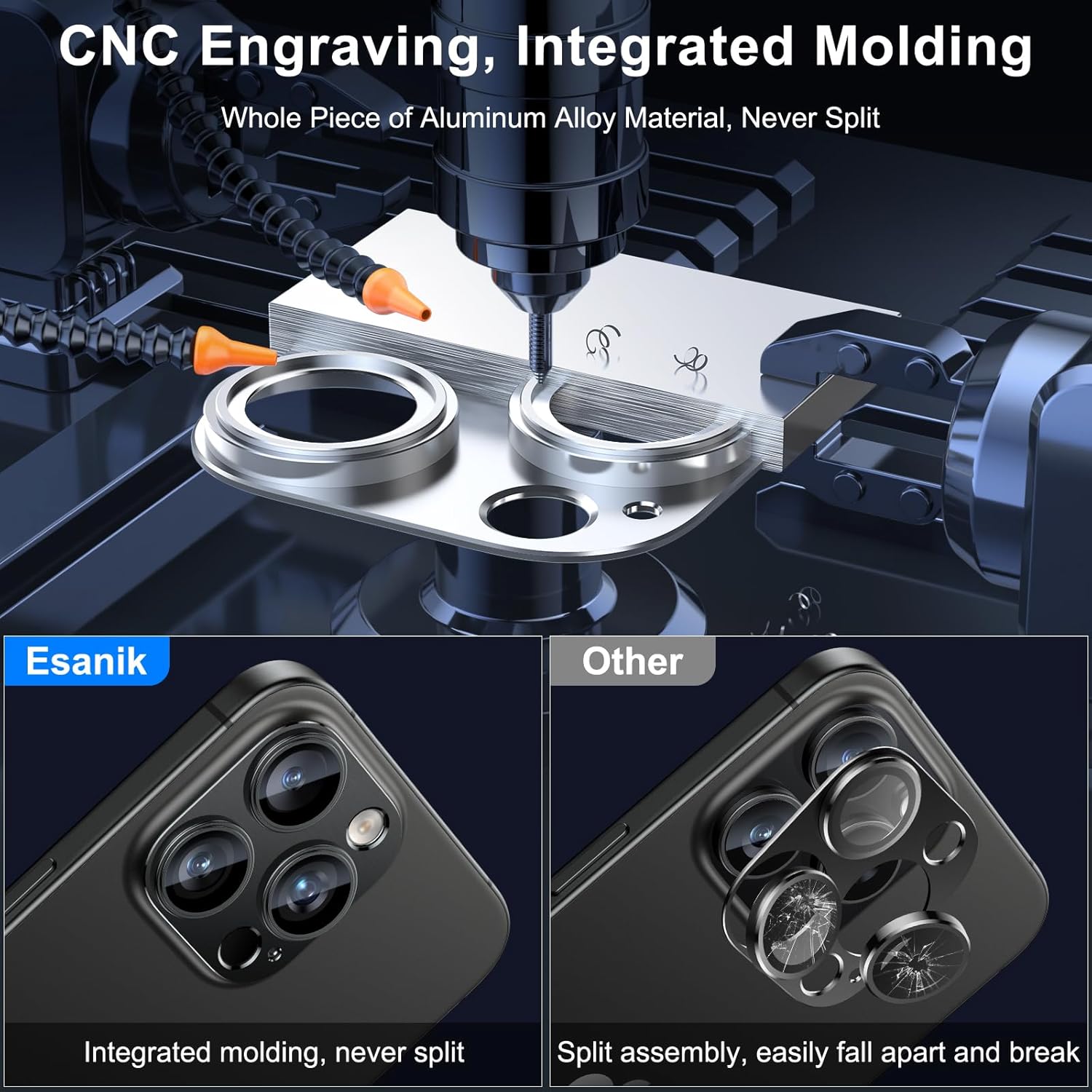 - ăCNC Engraving & Integrated Moldingă Esanik 2023 Upgrade Version iPhone 15 pro max / iPhone 15 Pro Cam Cover is precisely carved from whole piece of high-quality aluminum alloy, firm and long lasting. Bid farewell to the split and falling apart issues resulting from the conventional split assembly process.
