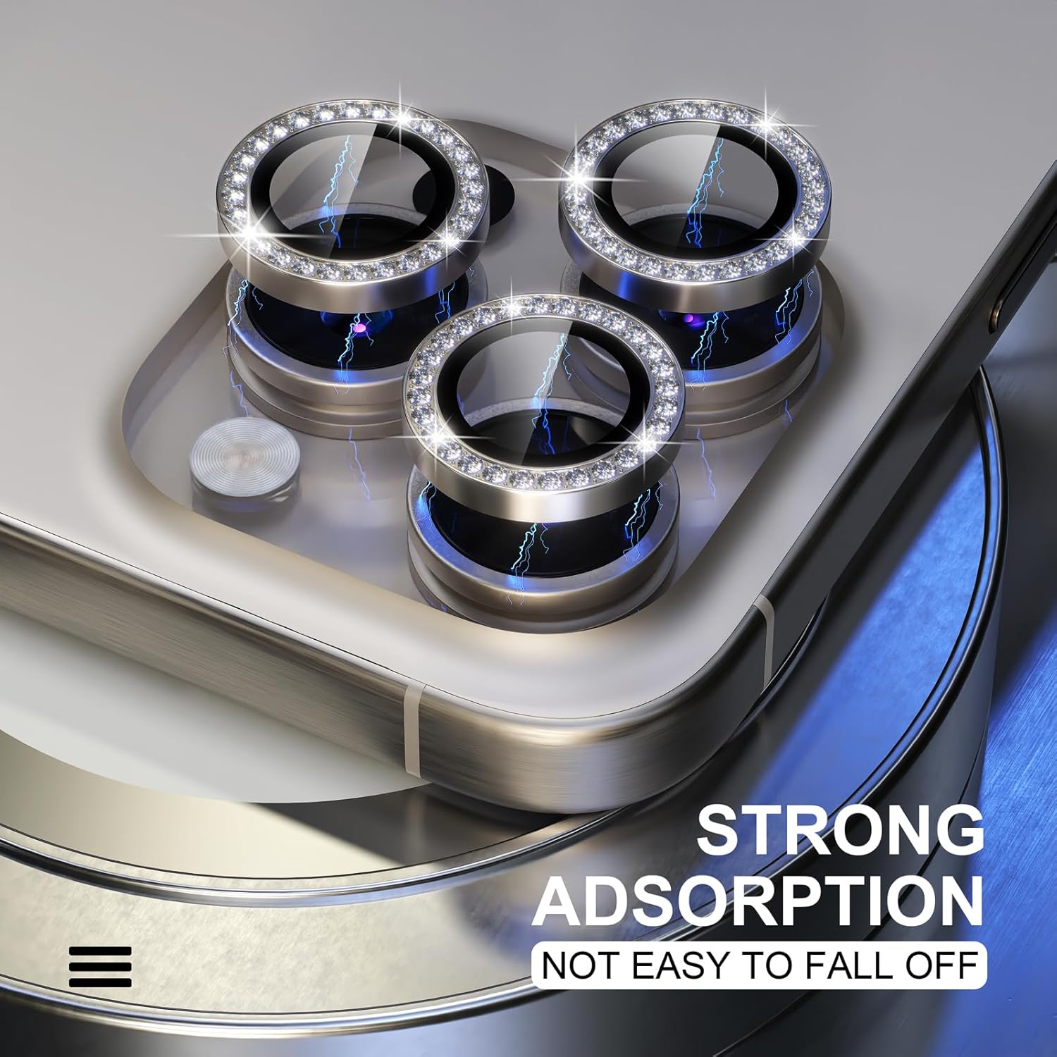 - Personalized Decoration: Made of high-quality aviation aluminum metal ring and 9H tempered glass and inlaid with bling rhinestones to give your 16 Pro/Pro Max camera lens a diamond gorgeous appearance, shining in the sun, very eye-catching and complimentary.