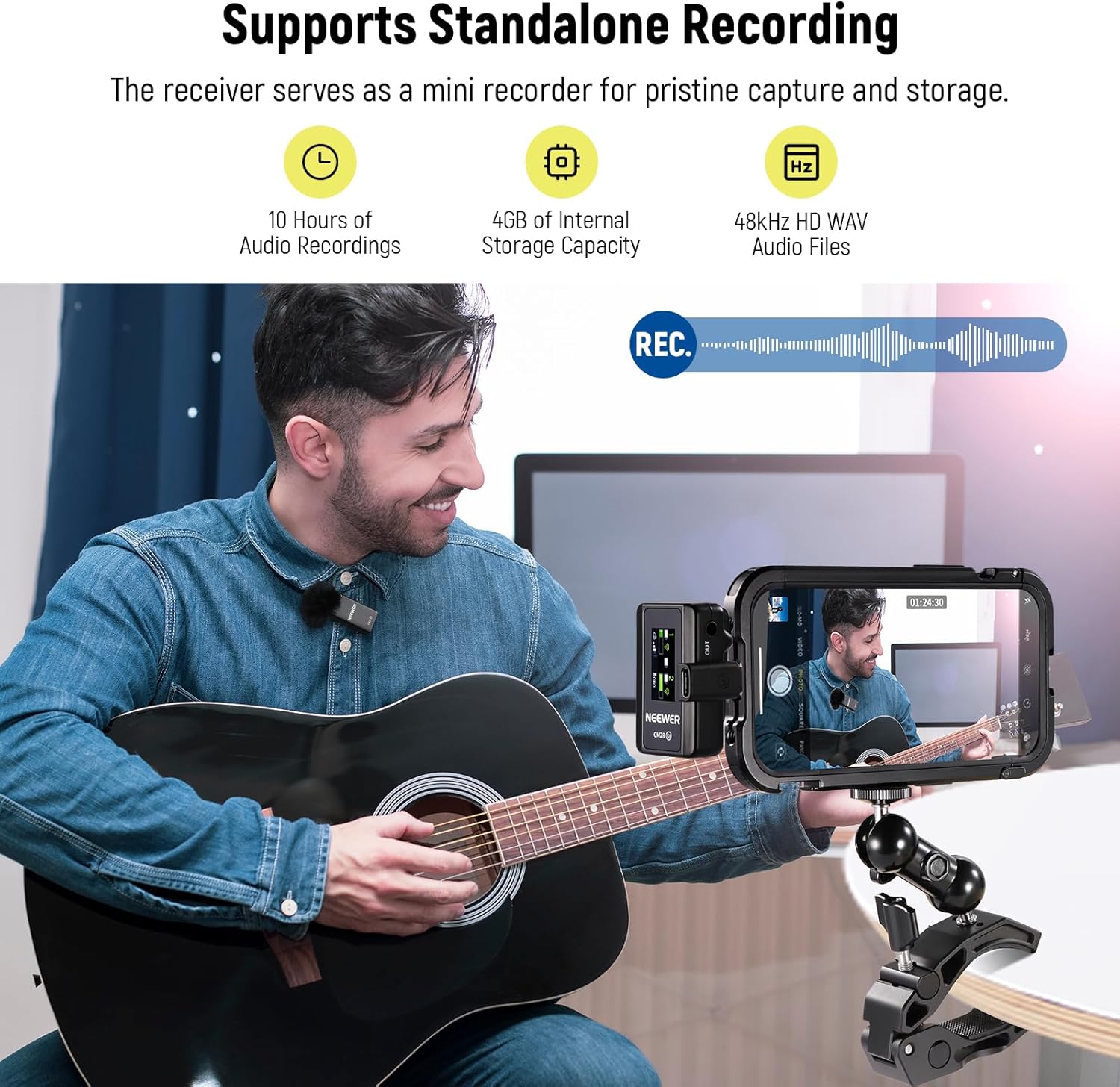 - ăStandalone Recording Accessoriesă The TXs double as recording pens with each 4GB storage, saving up to 9 hours of uncompressed 48KHz WAV audio files. 3 audio export modes: Mono, Stereo, and Ms. Support one tap decibel (dB) gain. An LCD screen displays modes, volume, battery levels, connection status, noise reduction, etc. These small wireless lav mics are portable essentials as a starter tool kit for TikTok, YouTube, and other social media content creators, influencers