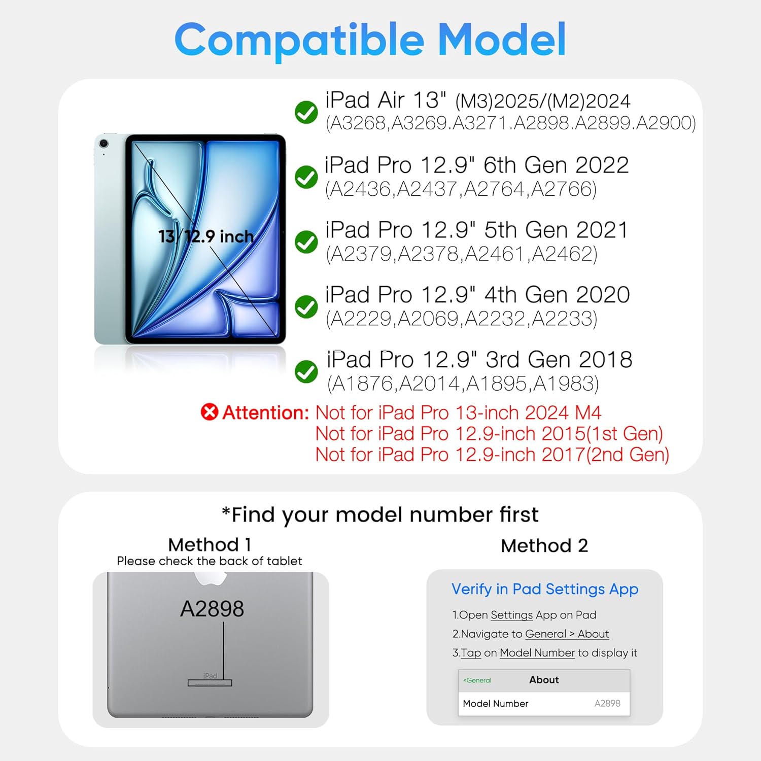 - Compatible Devices : iPad Air 13 inch (M2)2024/(M3) 2025, iPad Pro 12.9 inch 6th Generation 2022(Model:A2436/A2437/A2764/A2766), iPad Pro 12.9" 3rd Gen 2018(Model: A1876/A2014/A1895/A1983), iPad Pro 12.9" 4th Gen 2020(Model: A2229/A2069/A2232/A2233), iPad Pro 12.9" 5th Generation 2021(Model: A2379/A2461/A2462) iPad Air 13 inch (M2)2024/(M3) 2025, iPad Pro 12.9 inch 6th Generation 2022(Model:A2436/A2437/A2764/A2766), iPad Pro 12.9" 3rd Gen 2018(Model: A1876/A2014/A1895/A1983), iPad Pro 12.9" 4th Gen 2020(Model: A2229/A… See more