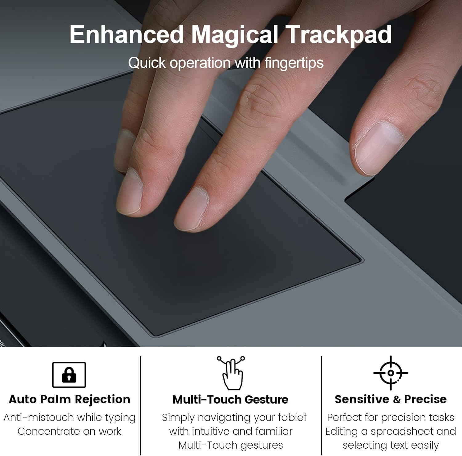 - Precise Trackpad - The sensitive trackpad allows for precise taps and supports Multi-Touch gestures such as scroll, drag or switch. Multitask, edit, and browse without touching the screen, significantly improving efficiency. With palm rejection technology, your typing won't be interrupted.