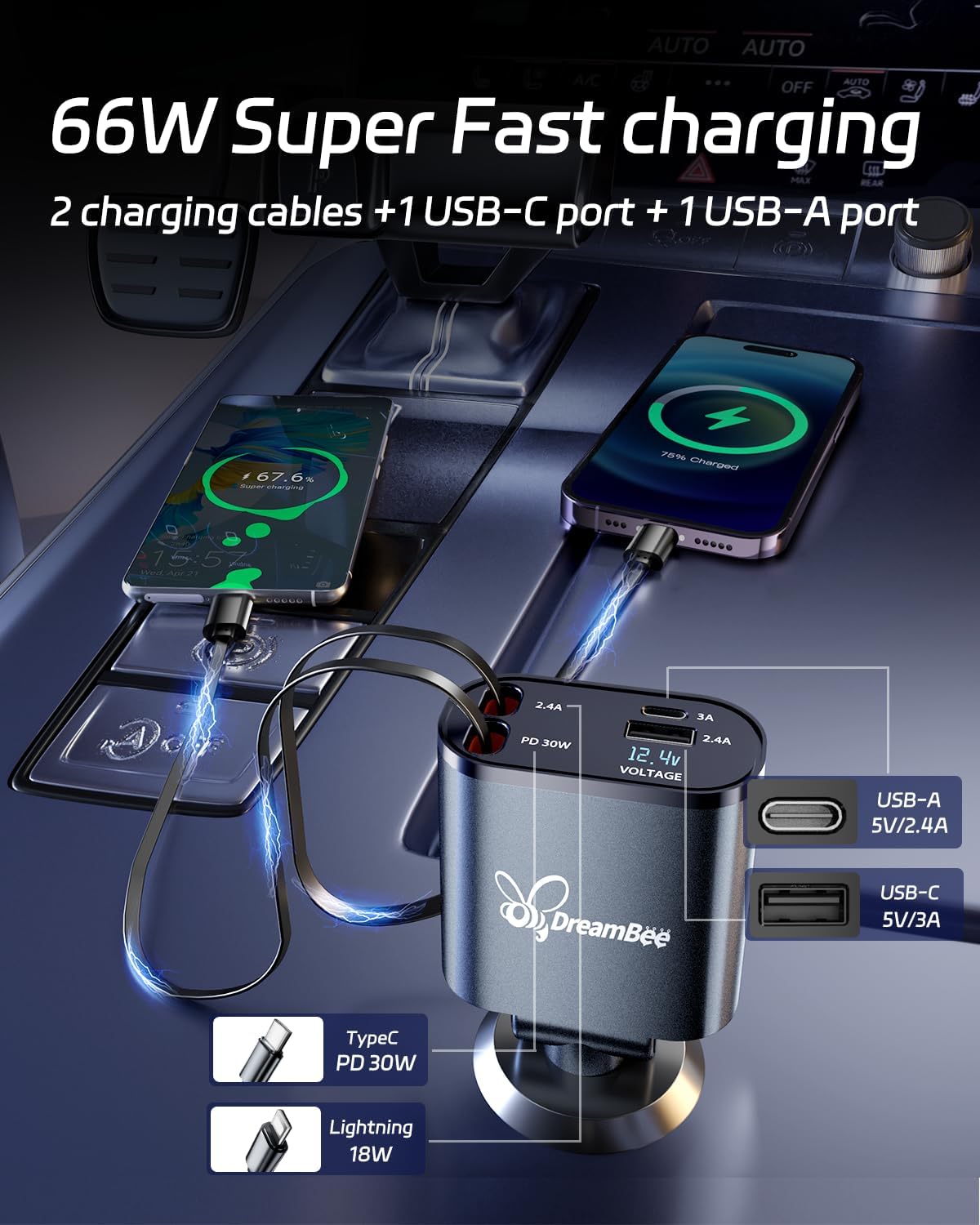 - ăUpgraded 4-in-1 Fast Charging SolutionăDreamBee car charger comes with a true PD30W fast-charging Type-C retractable cable, an 18W fast-charging IOS retractable cable, and additional USB-C and USB-A ports for fast charging up to four devices simultaneously. No need for multiple chargers, just one compact device for all your charging needs