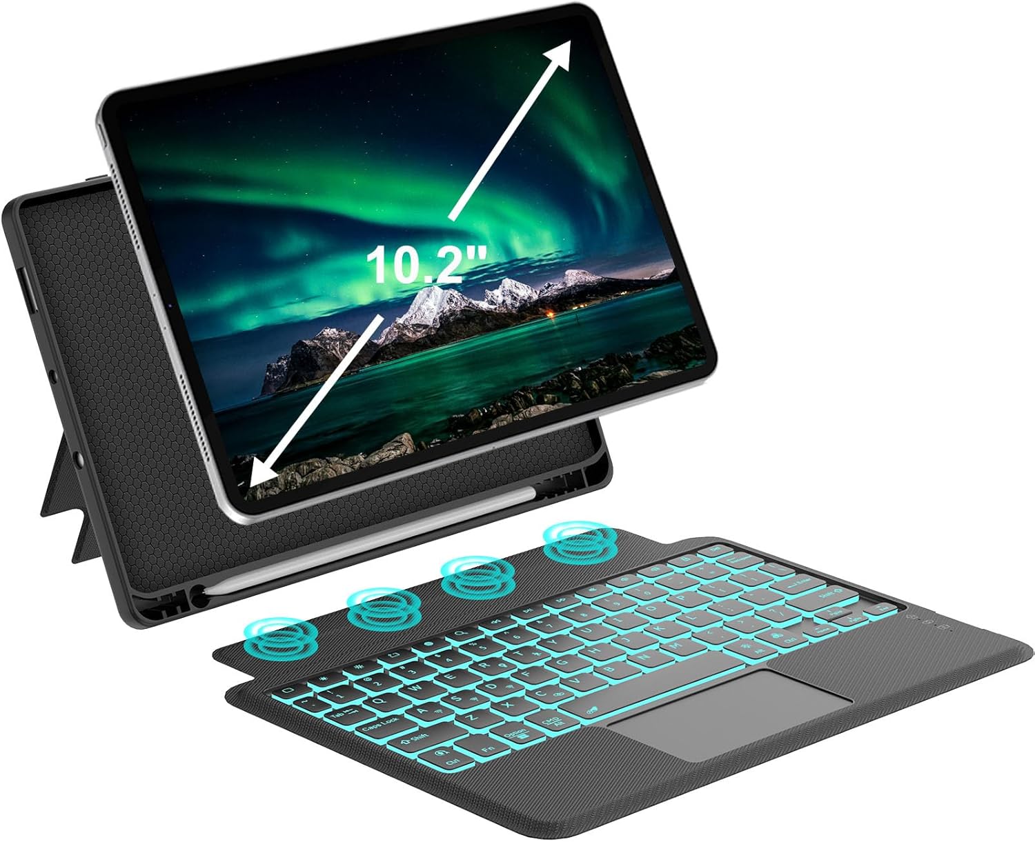 Touch for iPad 9th/8th/7th Generation Case with Keyboard 10.2 Inch, Multi-Touch Trackpad, 7 Color Backlit, Detachable Magnetic Folio Cover with Pencil Holder for iPad Air 3rd Gen/iPad Pro 10.5" Black