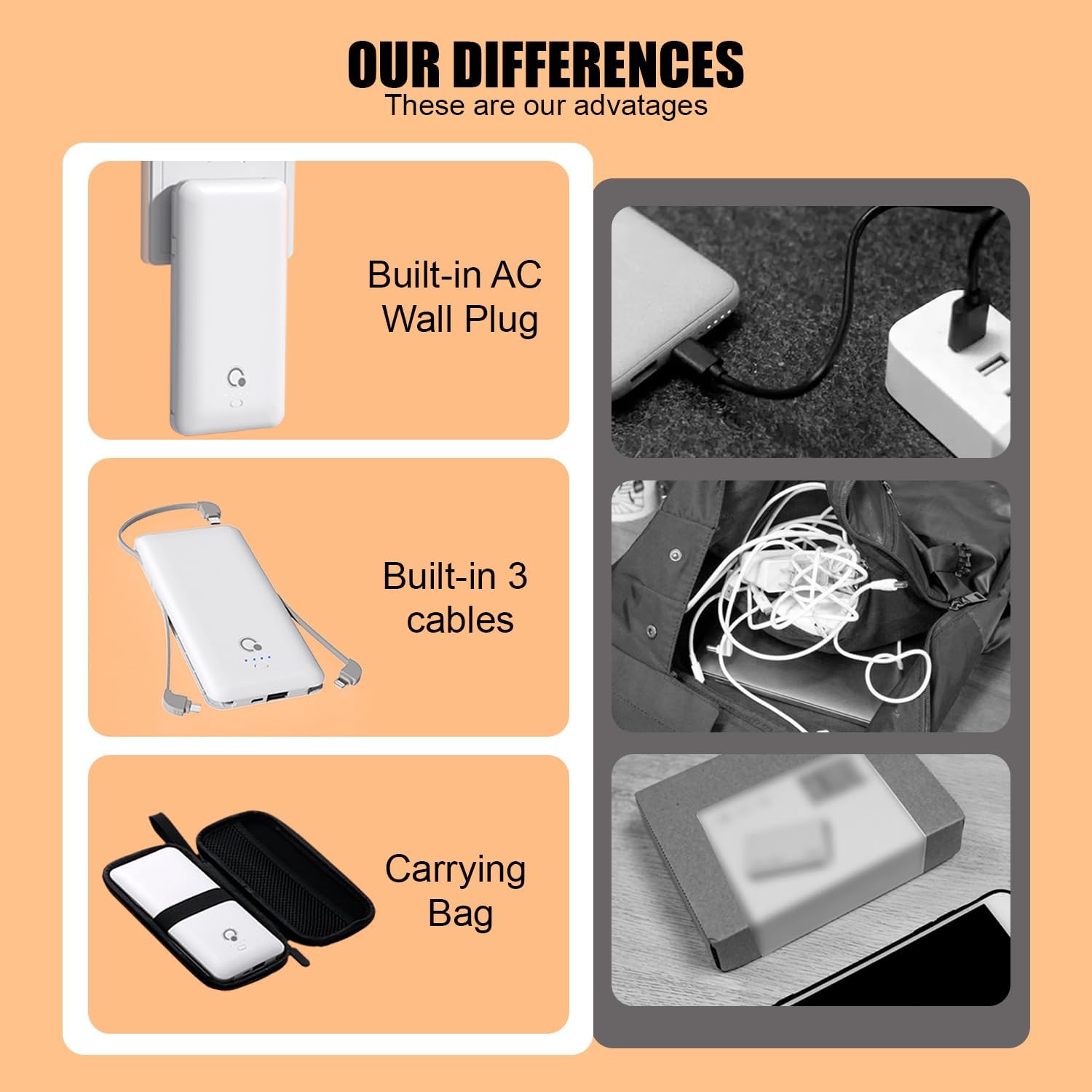 - [Slim and Compact Size Portable Charger]:Q External battery pack which make it easier to carry, built-in AC wall plug and cables are collapsible, will not give you too much trouble when carrying out
