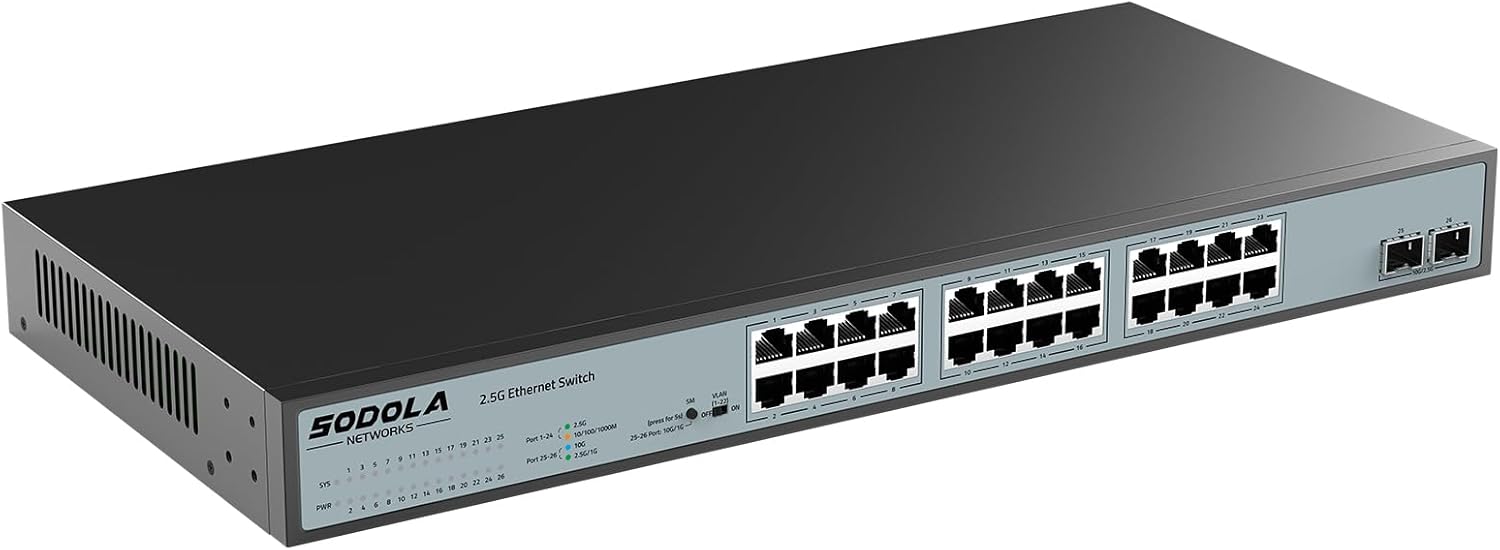 SODOLA 24 Port 2.5Gb Umanaged Switch,24X2.5G Base-T Ports,2X10G SFP, 160Gbps Switching Capacity,Port Isolation,/IU Rack-Mount/Fanless/Plug & Play Multi-Gig Unmanaged Ethernet Switch