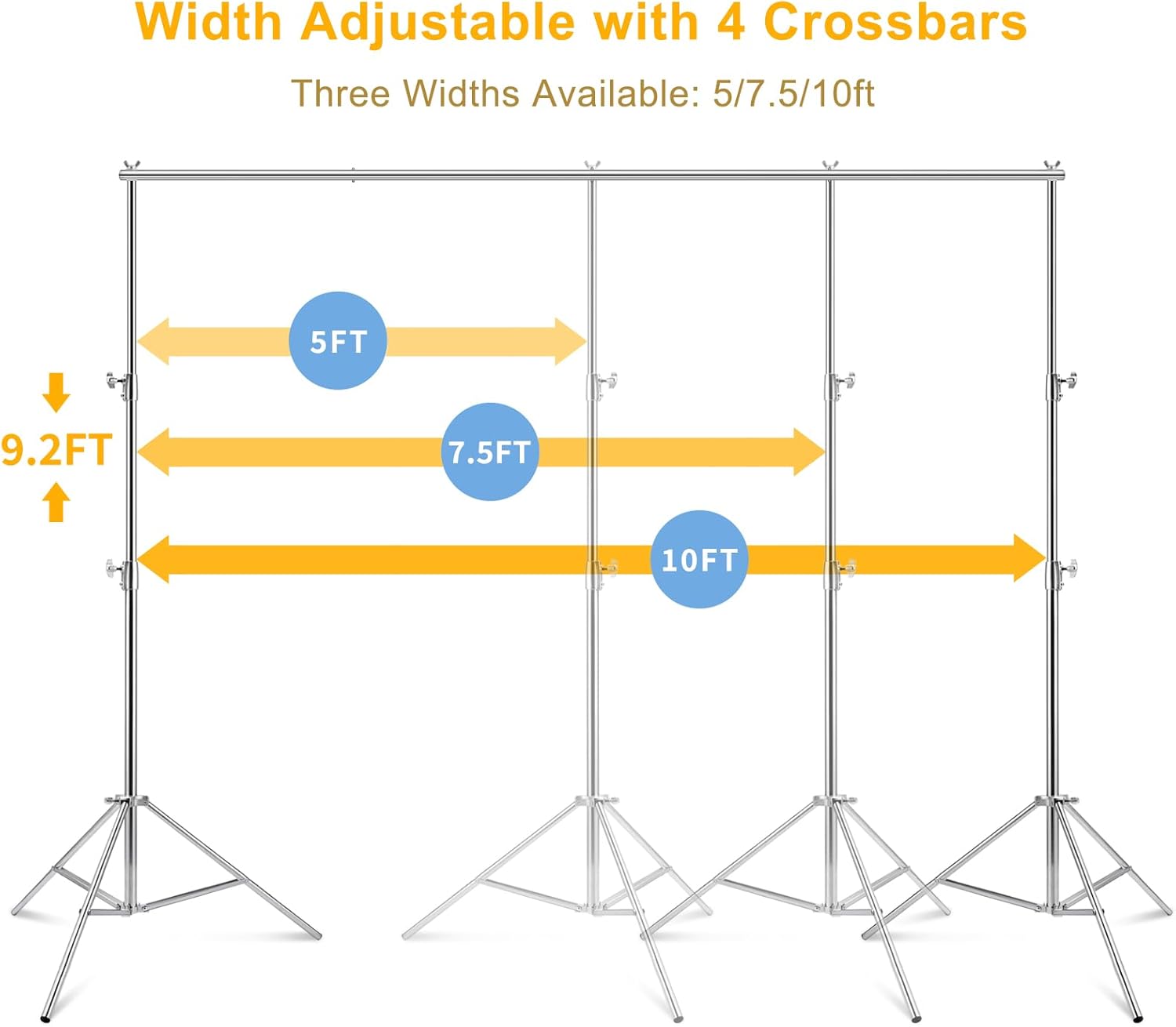 - 【Easy to Assemble】This photoshoot backdrop stand kit sets up in a snap. Tool-free assembly, spring-buffered for safety, and telescopic backdrop stands adjust from 3.9ft to 9.2ft high and 5ft to 10ft wide - Back drop adjustable stand fits any backdrop perfectly